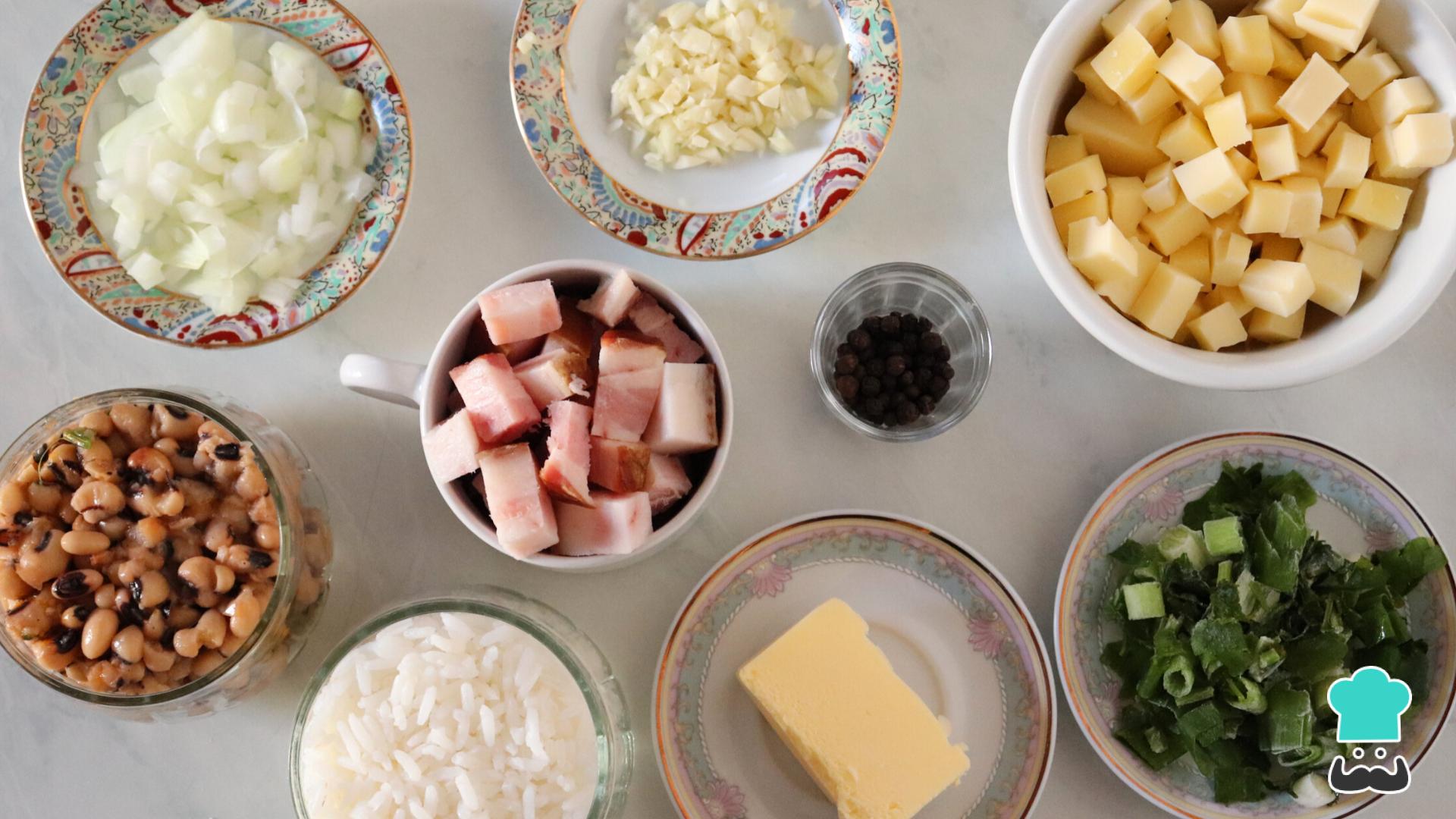 Separe os ingredientes. Pique a cebola, o alho e o cheiro verde/coentro e corte o queijo coalho e o bacon em cubos. Essa receita é perfeita para fazer com aquele arroz e feijão que sobrou do almoço.