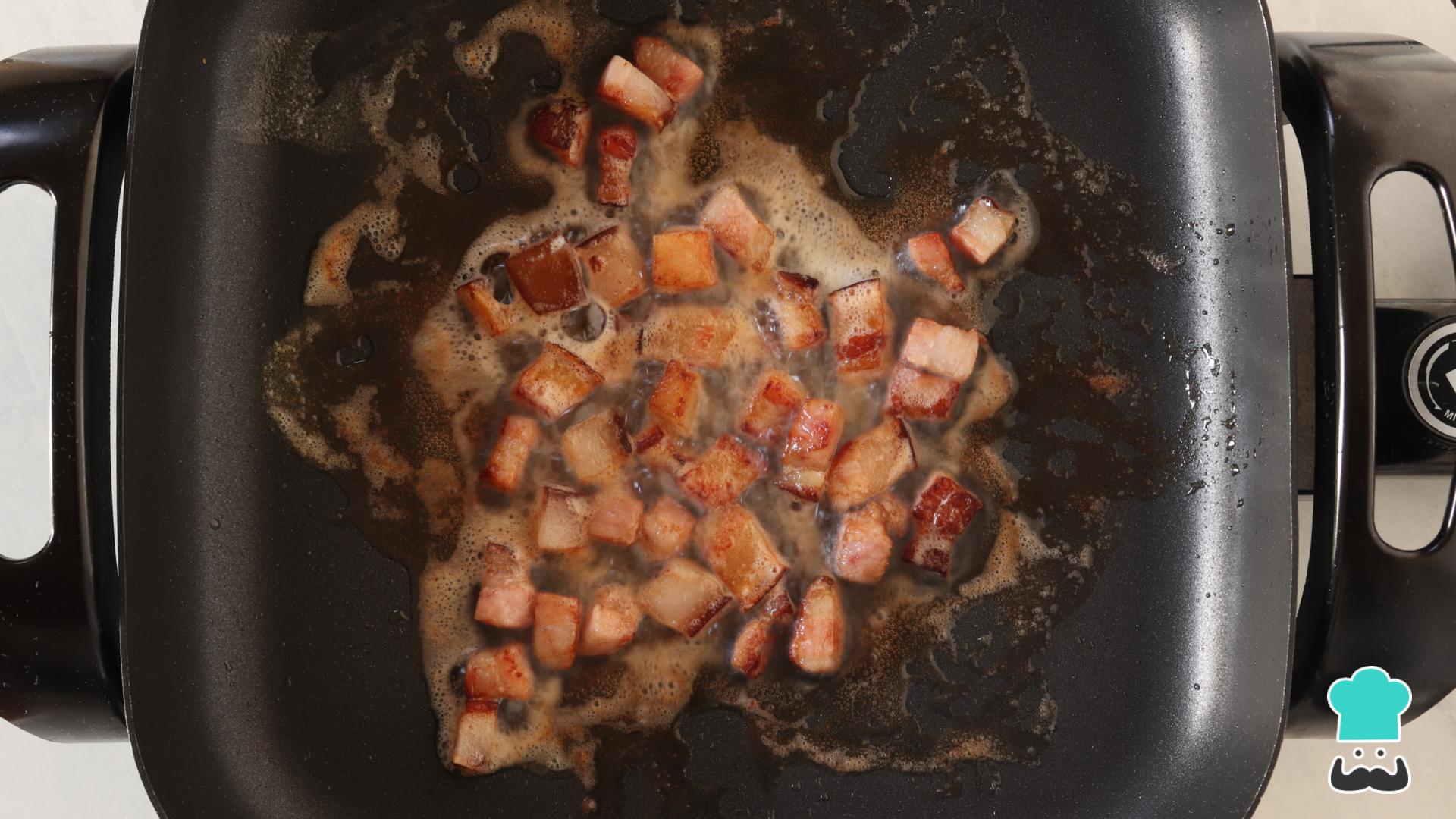 Para fazer esse baião de dois nós usamos uma única panela. No caso, uma panela elétrica, que funciona muito bem para esse tipo de receita. Comece aquecendo bem a panela e dourando o bacon na manteiga (o bacon deve reduzir pela metade e ficar crocante).