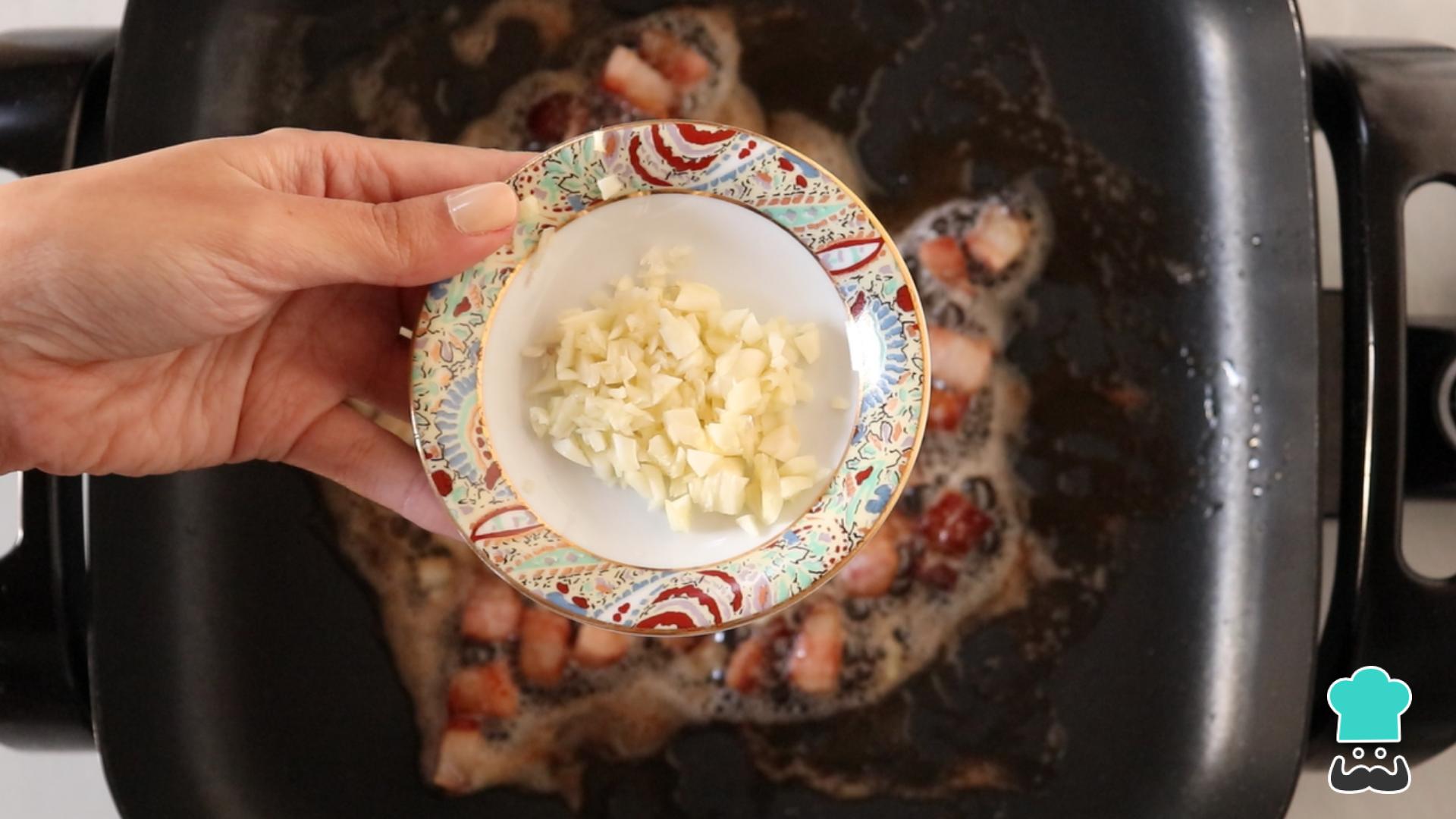 Em seguida acrescente a cebola e deixe até murchar. Logo depois coloque o alho até dourar.