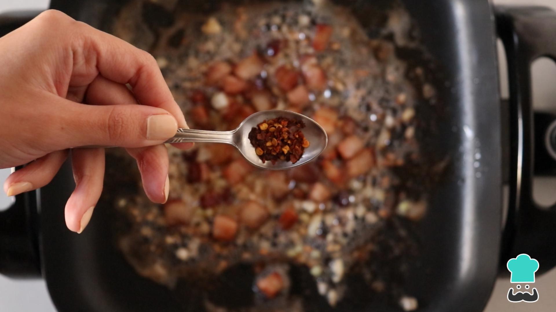 Acrescente a pimenta calabresa seca (bem pouquinho, porque ela é bem forte!) e misture. Esse prato deve ficar levemente apimentado.