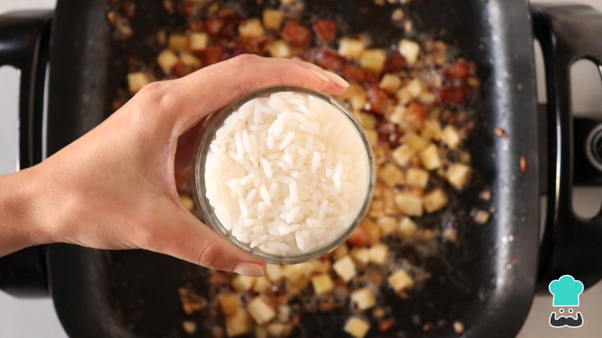 Junte o arroz cozido e deixe pegar gosto por mais ou menos 1 minuto.
