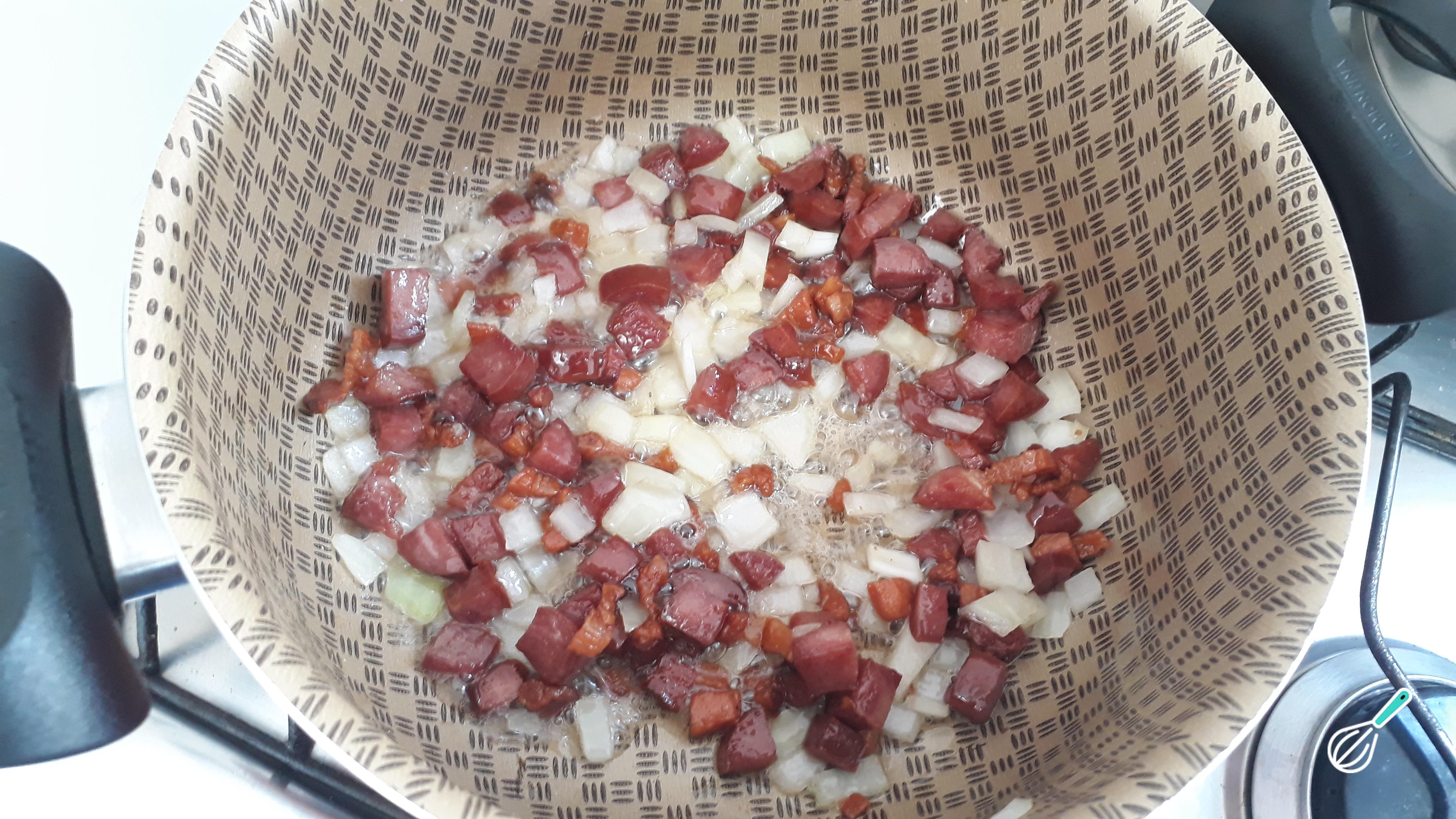 Em uma panela, frite o bacon até ficar bem dourado, em seguida, junte a calabresa, frite por mais alguns minutos e, por último, junte a carne seca desfiada