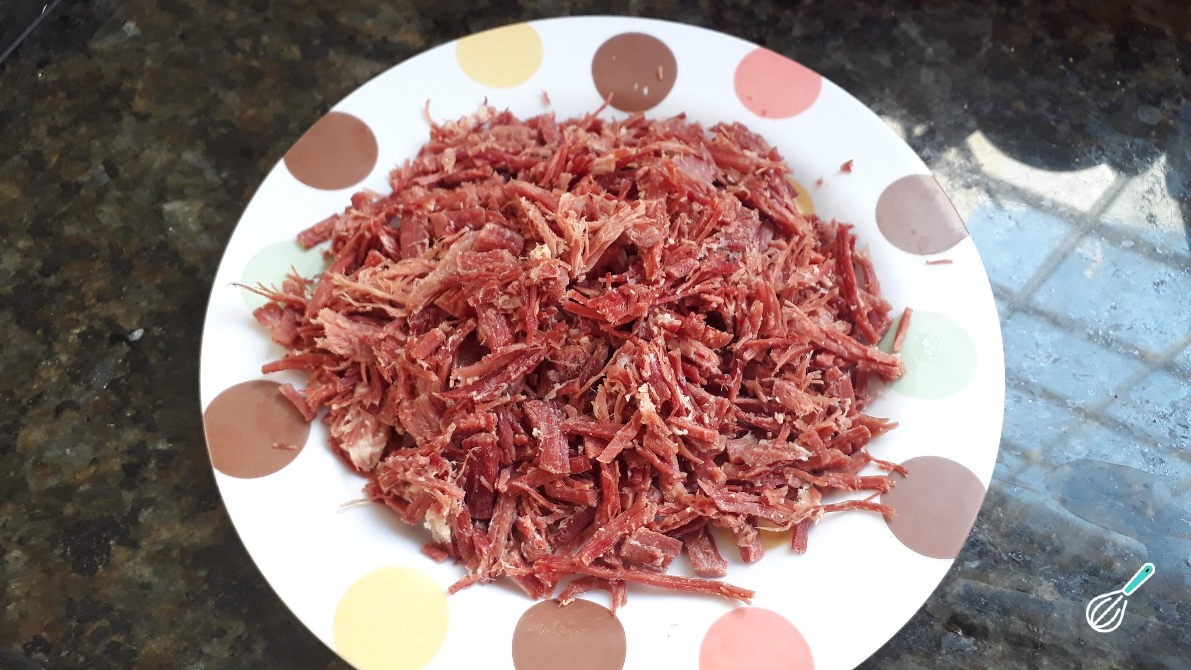 Para a carne seca, basta dessalgar na água de um dia para o outro. Deixe de molho na água por 24h trocando a água de 3 a 4 vezes. Cozinhe na pressão por 35 minutos e desfie com o auxílio de um garfo, mixer ou, até mesmo, na batedeira, dá super certo!