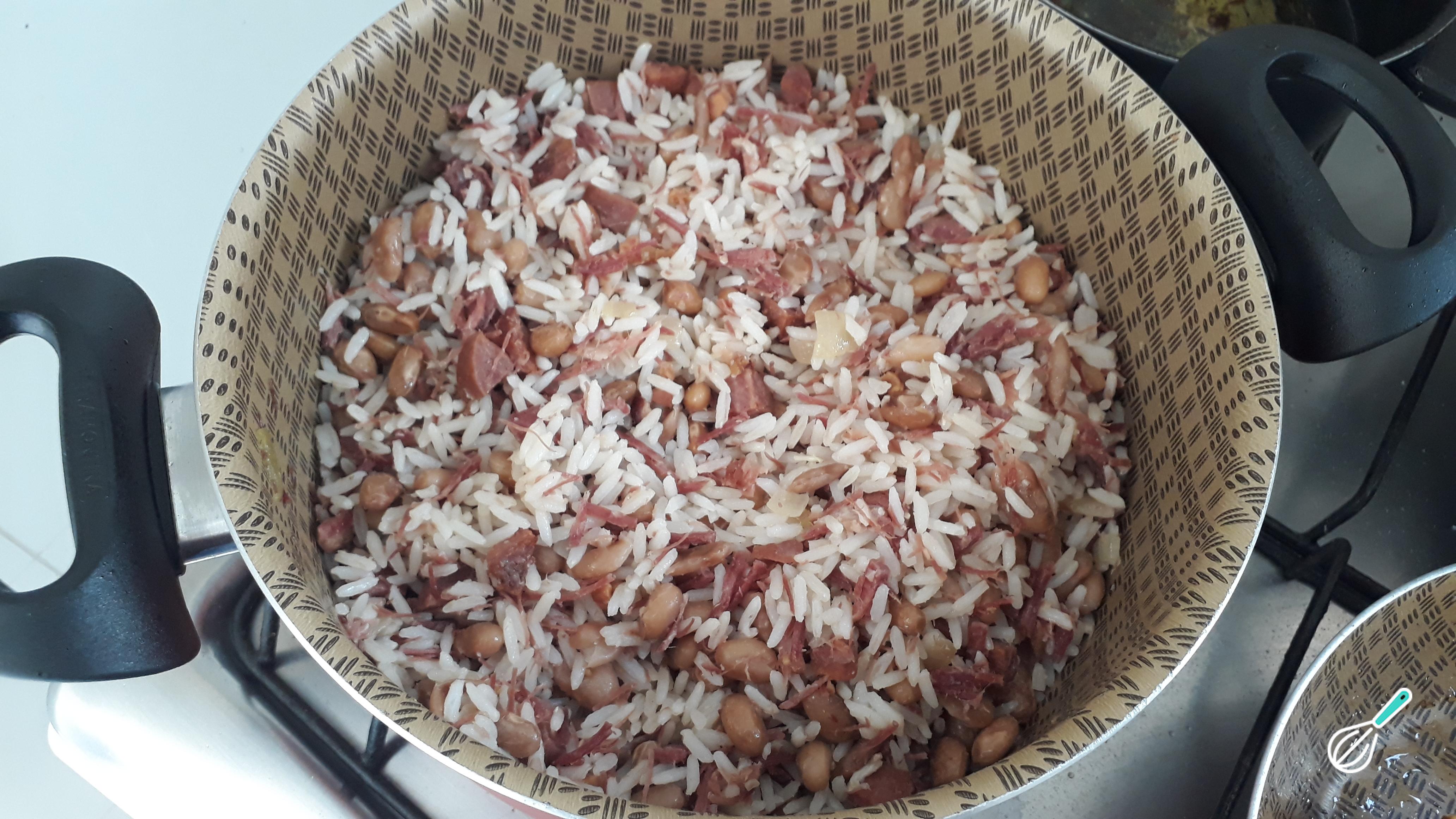 Se você quiser cozinhar o arroz junto no baião, basta acrescentar no refogado de bacon, calabresa e carne seca, o feijão cozido al dente e o arroz cru. Cobrir com 3 copos de água e deixar cozinhar no fogo baixo até que a água seque por completo