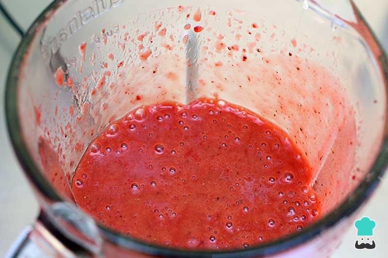 Para preparar bala de morango fácil, a primeira coisa que você deve fazer é limpar e triturar os morangos para formar um purê. Você pode usar o liquidificador ou o processador de alimentos para fazê-lo.