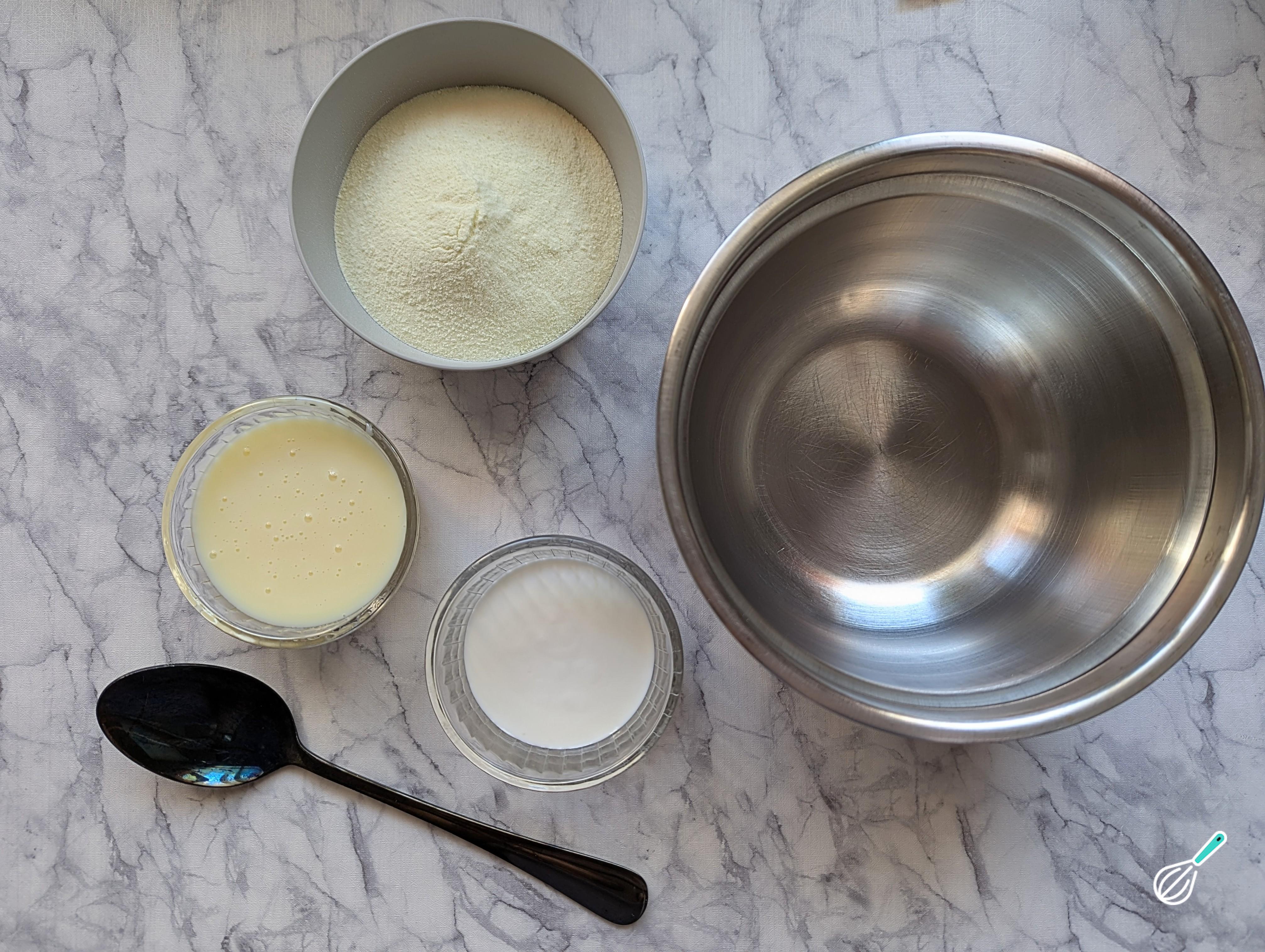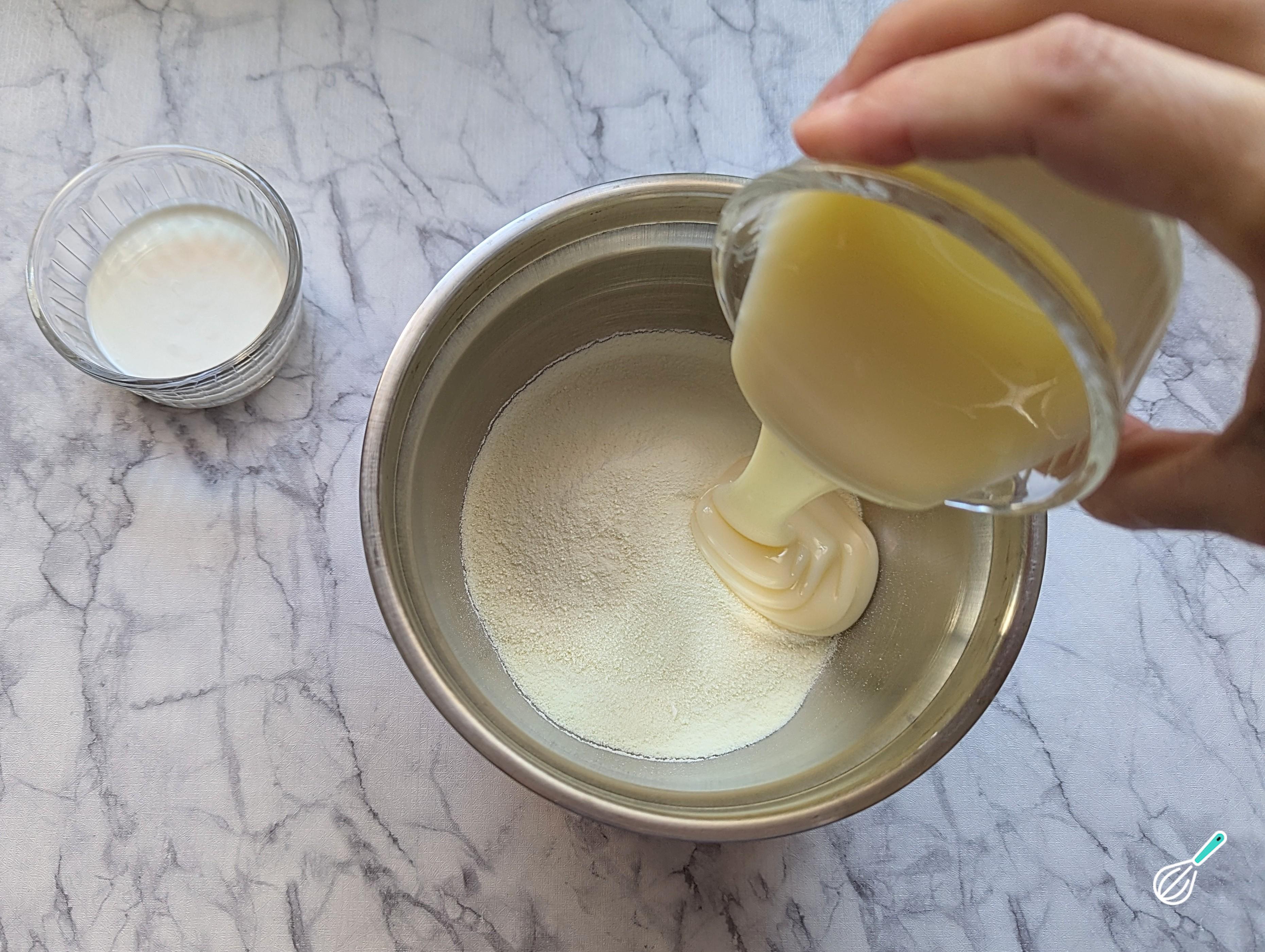 Em uma tigela grande, adicione o leite em pó peneirando e o leite condensado. Se desejar uma textura mais macia, adicione o creme de leite.
