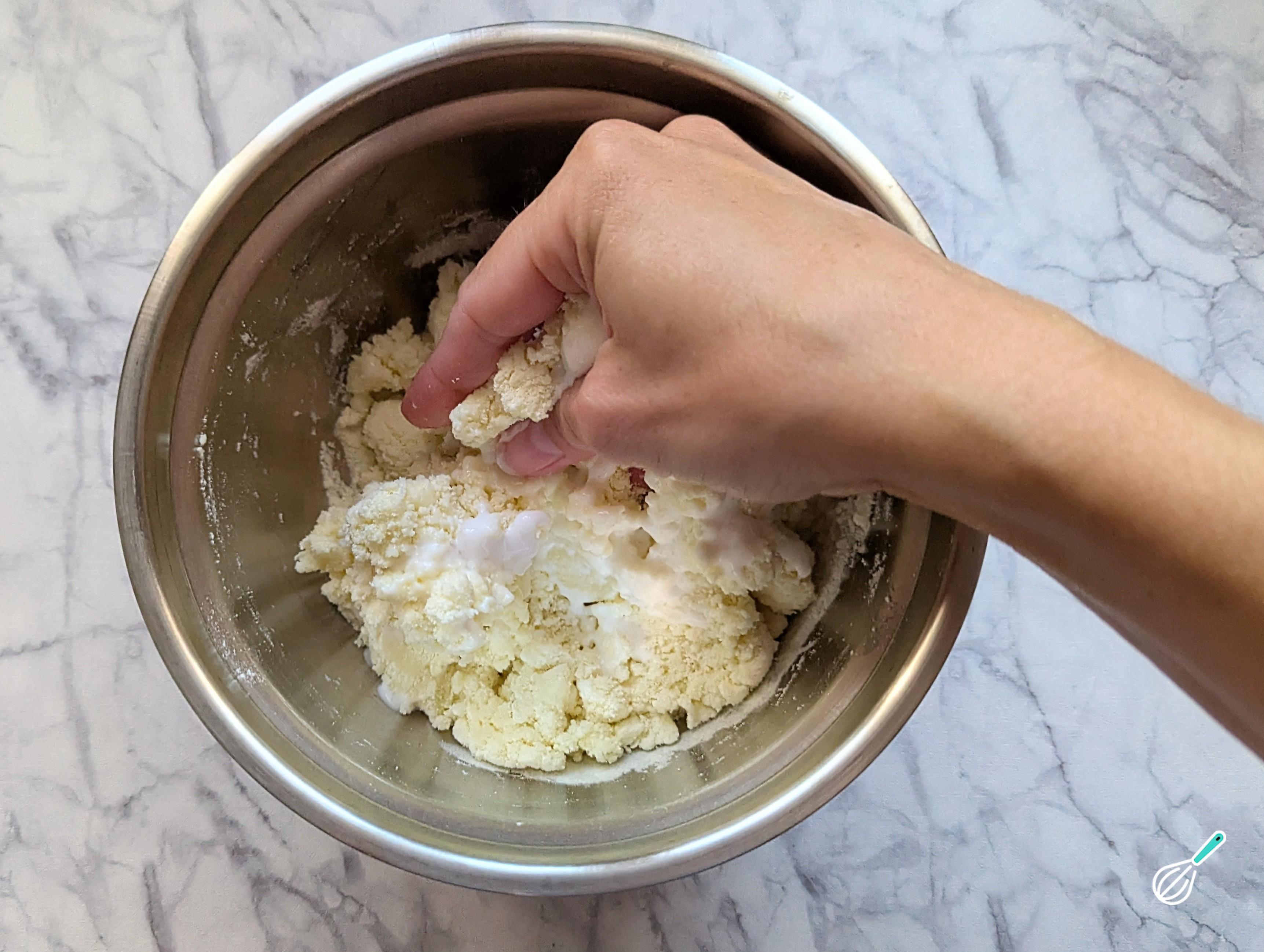 Misture tudo até formar uma massa homogênea, no início dá para misturar com a ajuda de uma colher, quando ficar difícil de mexer, use as mãos. No começo pode parecer que a mistura está seca, mas vá amassando com gentileza até a massa dar liga.