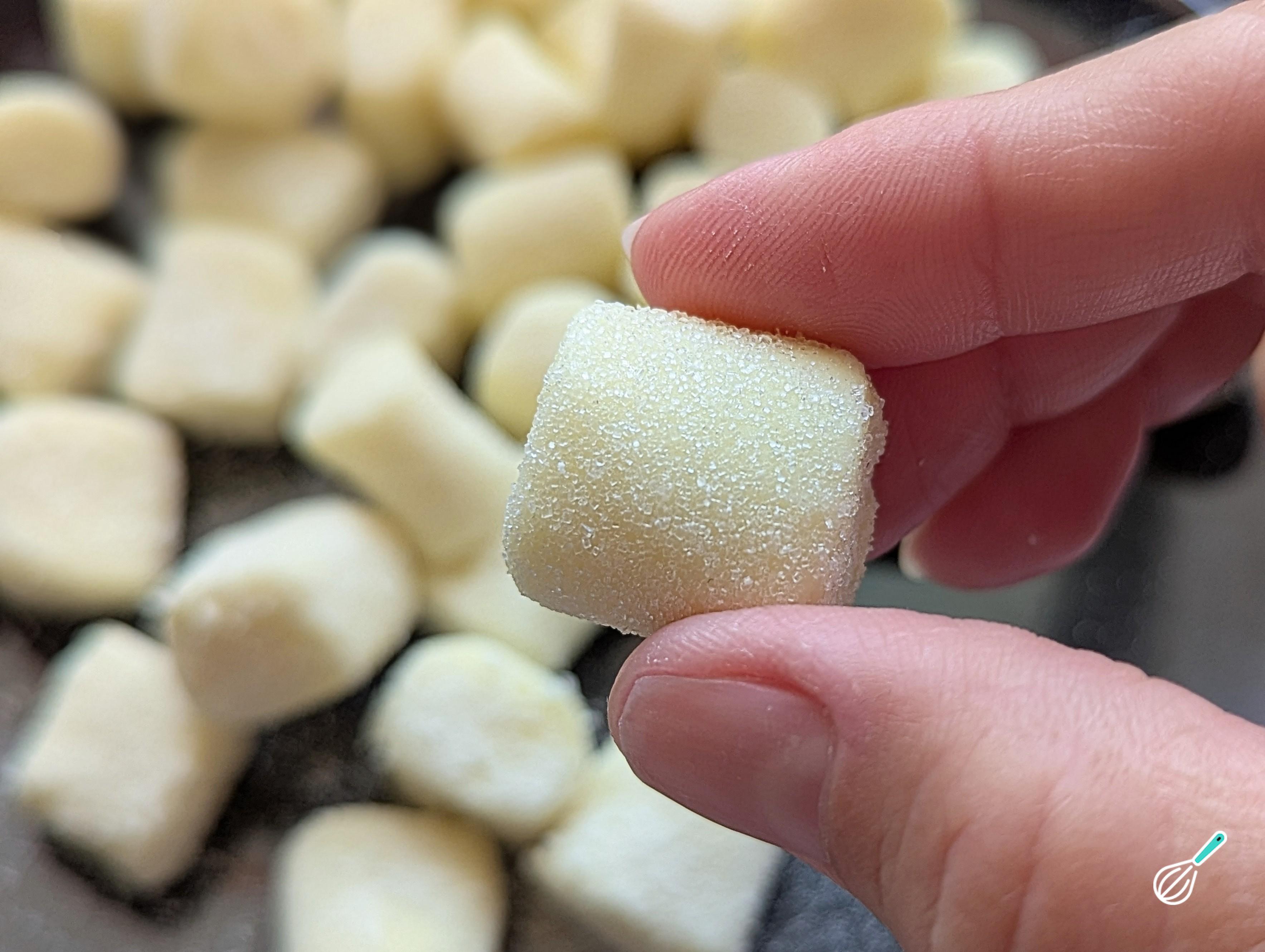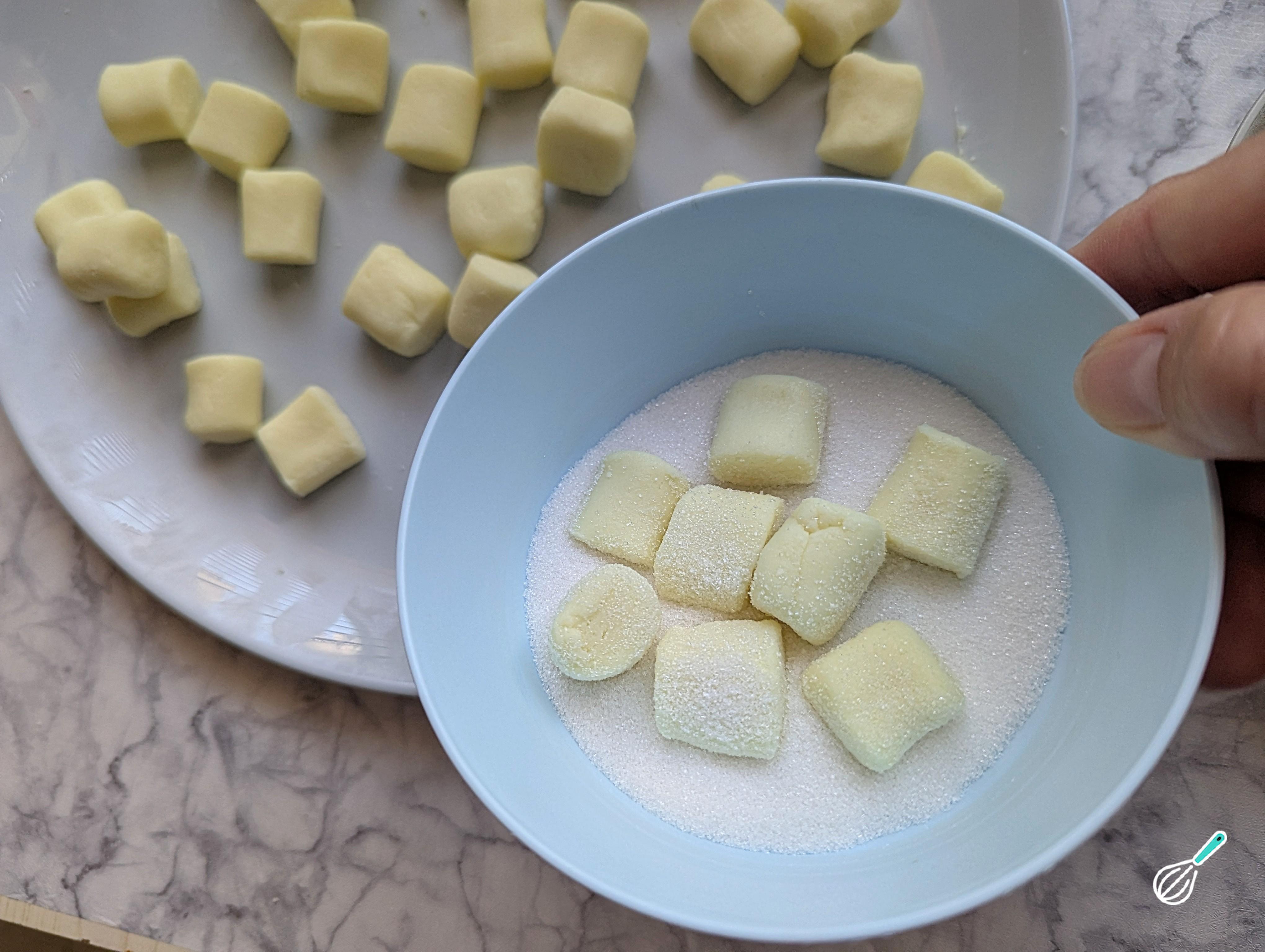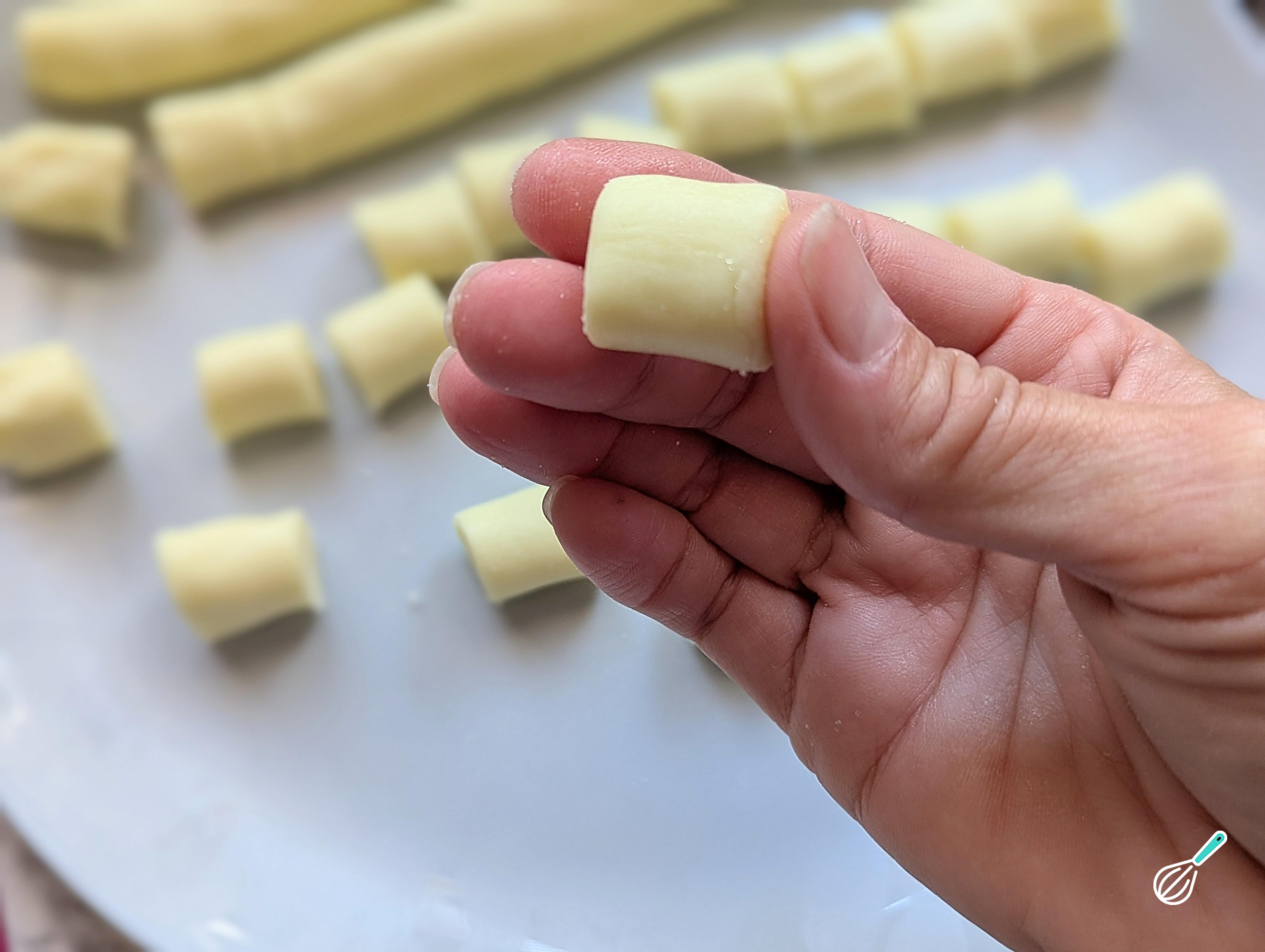 Pegue pequenas porções da massa e enrole usando as mãos formando pequenos bastões, logo use uma espátula própria para corte de massas e faça pequenos quadrados ou use moldes em formas de silicone para criar formatos diferentes.