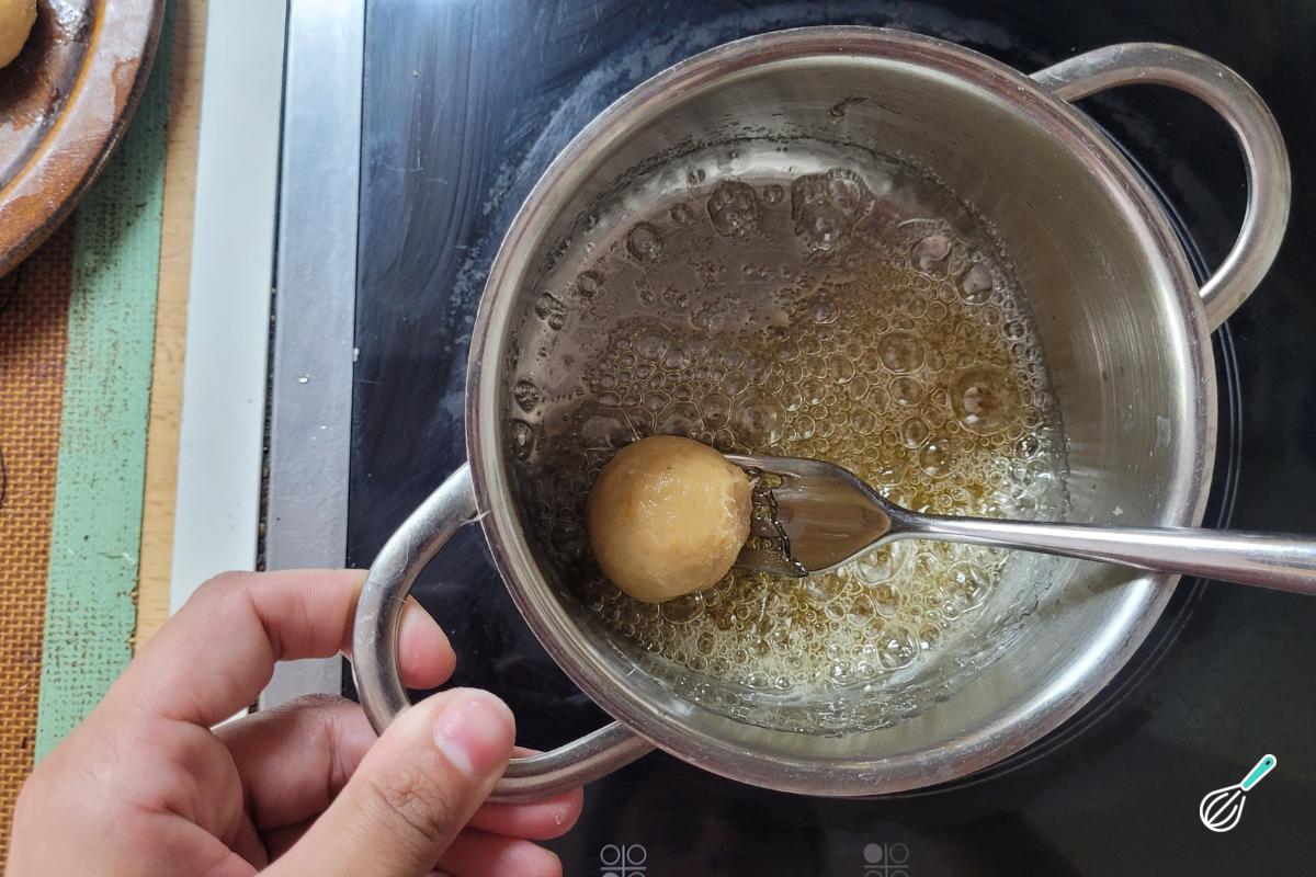 Assim que a calda atingir a temperatura, desligue o fogo e vá banhando as bolinhas. Use um garfo para facilitar. O processo deve ser feito rapidamente para evitar que o caramelo esfrie.