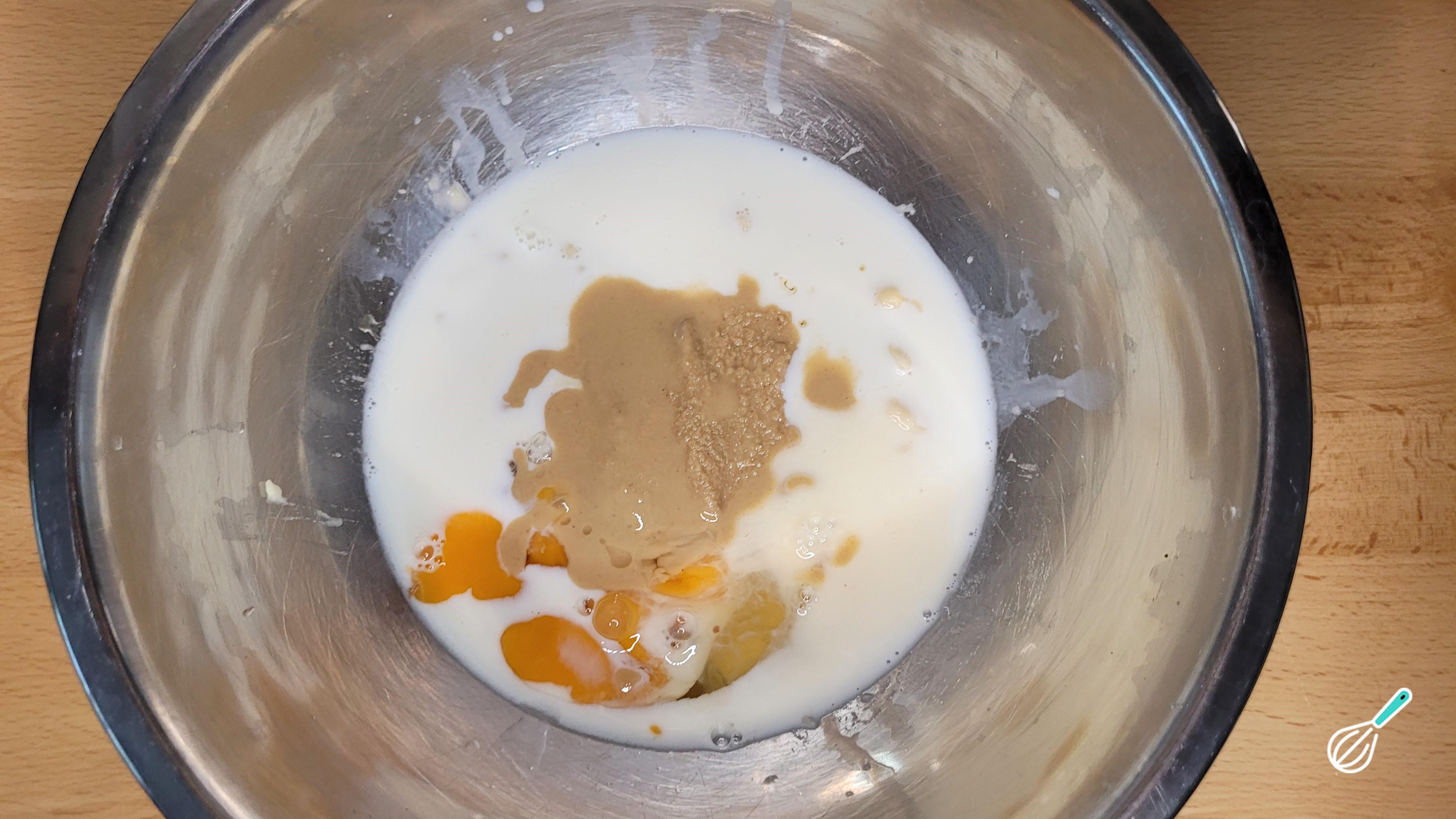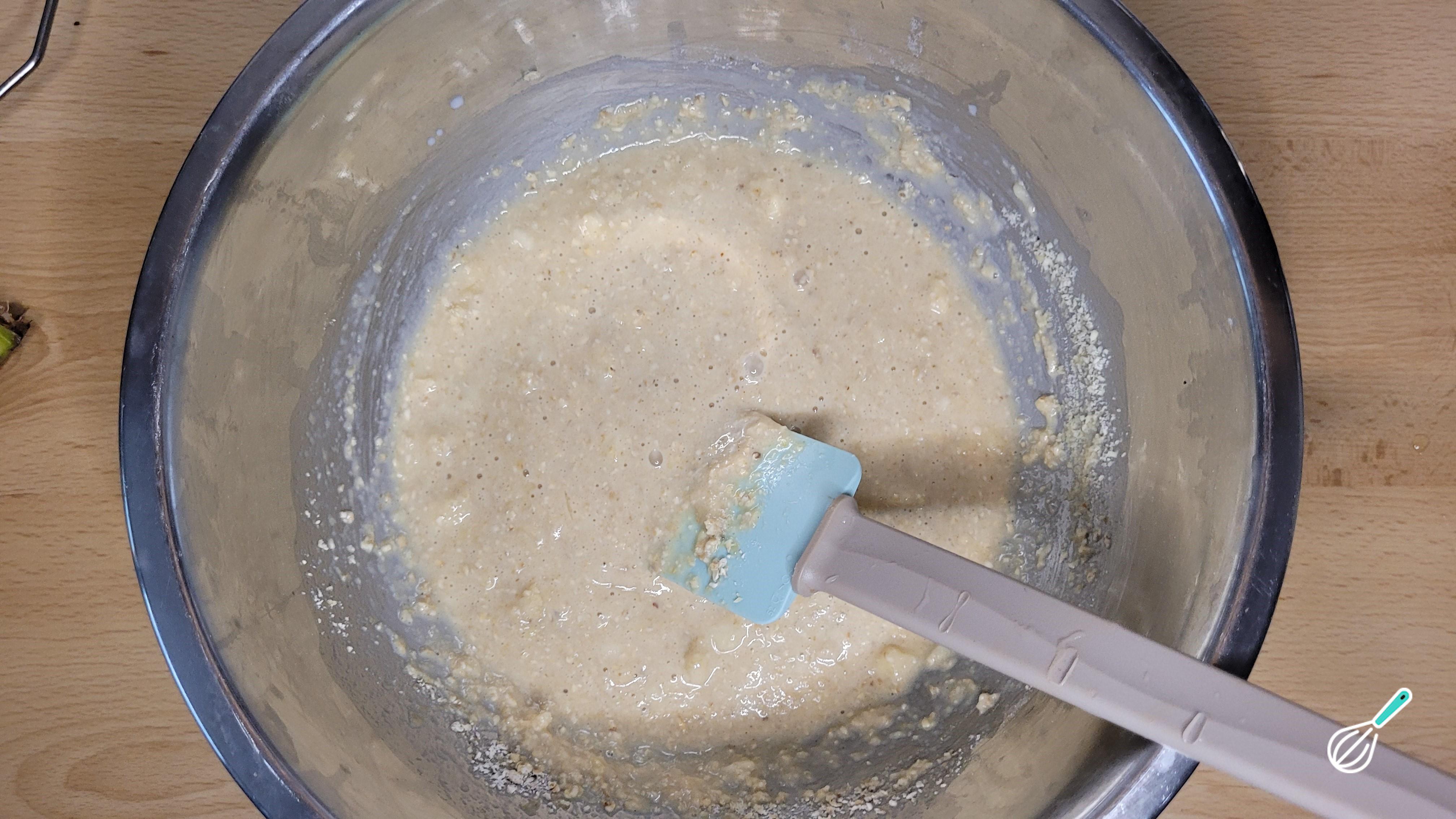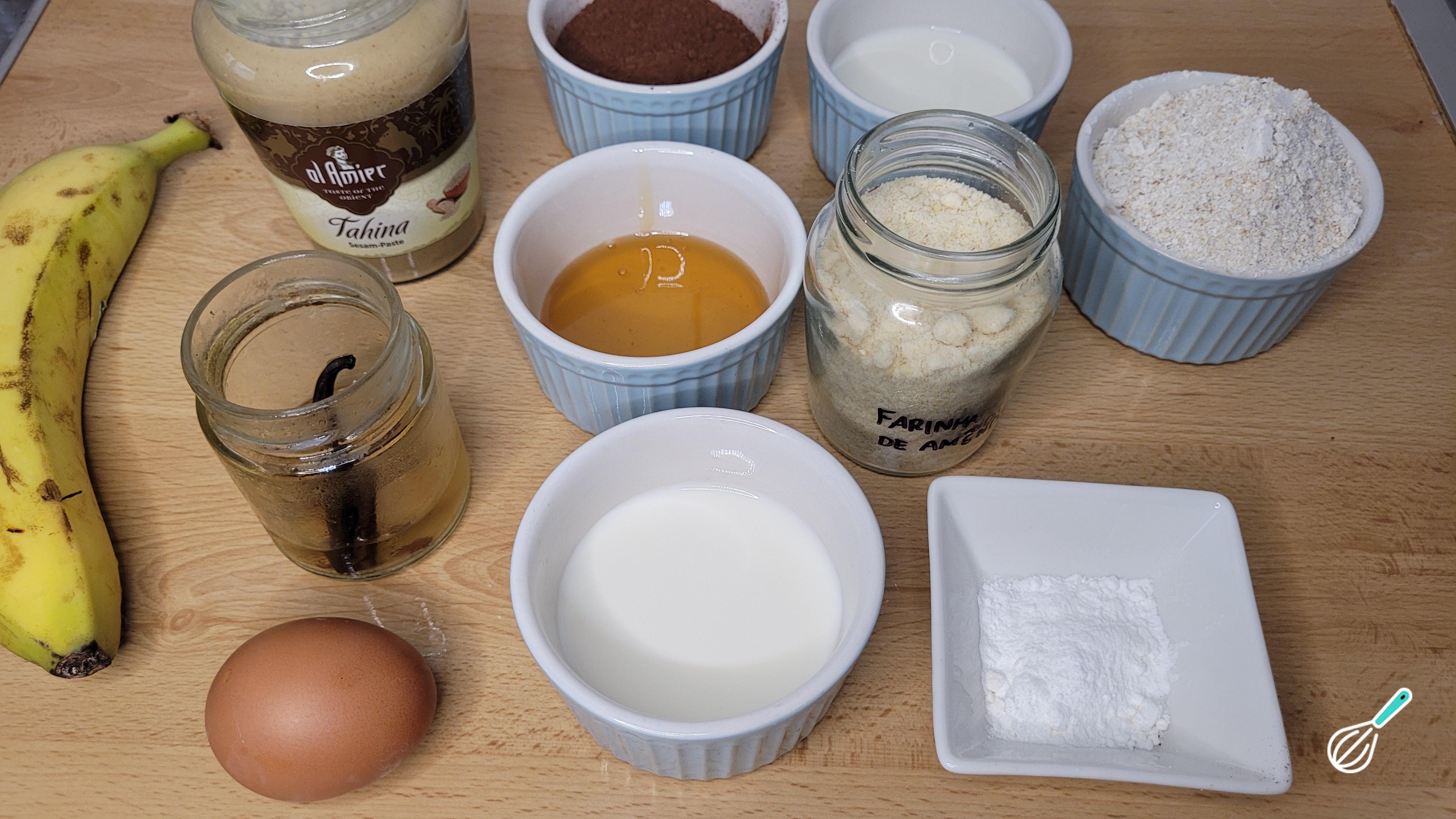 Amasse a banana, e adicione todos os ingredientes líquidos: ovo, leite, tahine, mel, tahine, extrato de baunilha. Mexa bem.