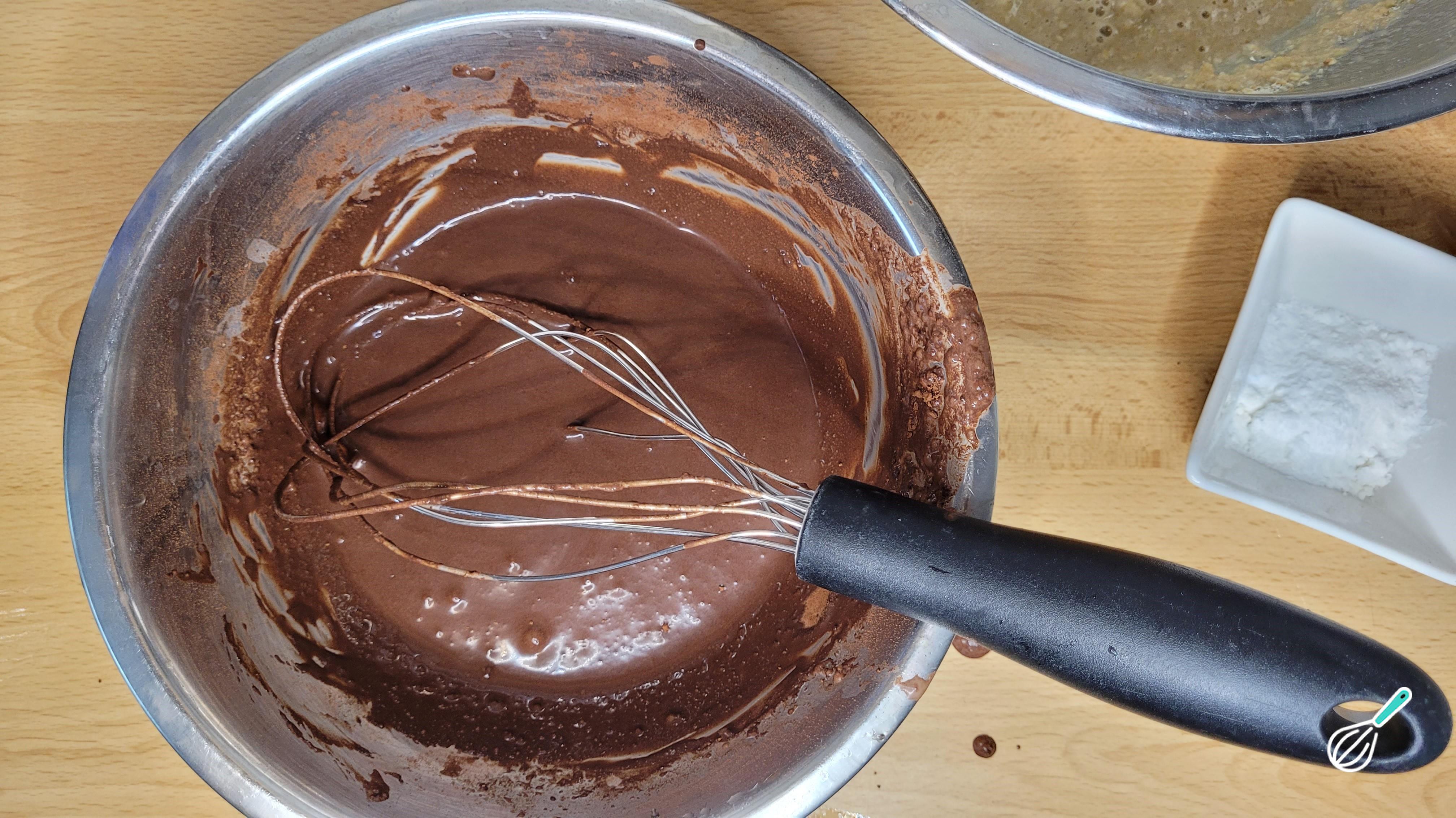Em uma tigela separada prepare a calda de chocolate que vai dar o efeito mesclado. Misture o cacau em pó e o leite. Se quiser que fique mais doce, pode substituir por chocolate em pó.