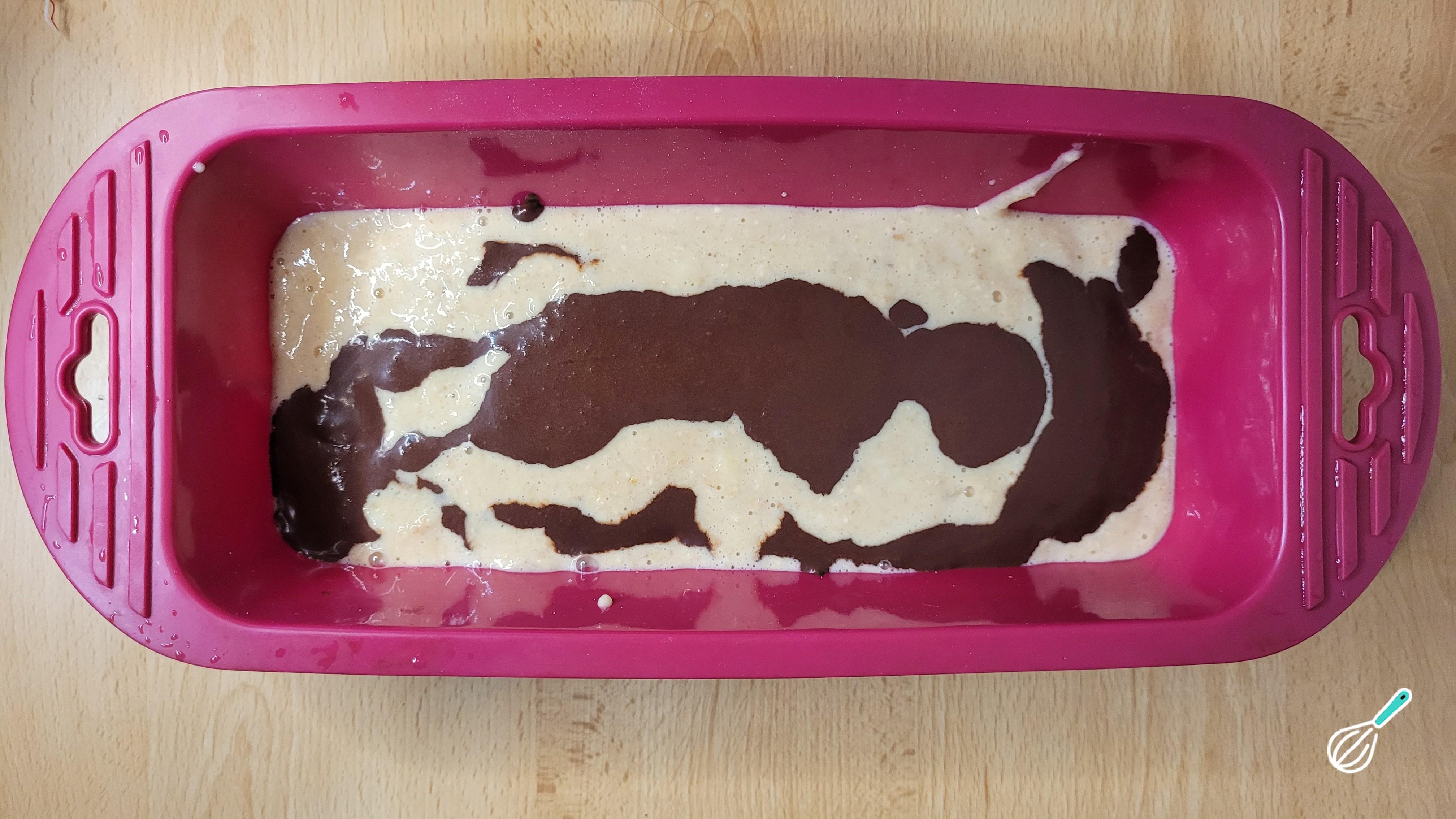 Adicione o fermento na massa principal e coloque na forma de bolo, intercalando a massa principal com a calda de chocolate para fazer o efeito mesclado. Leve para o forno preaquecido a 180oC, fazendo o teste do palito para saber quando está pronto.