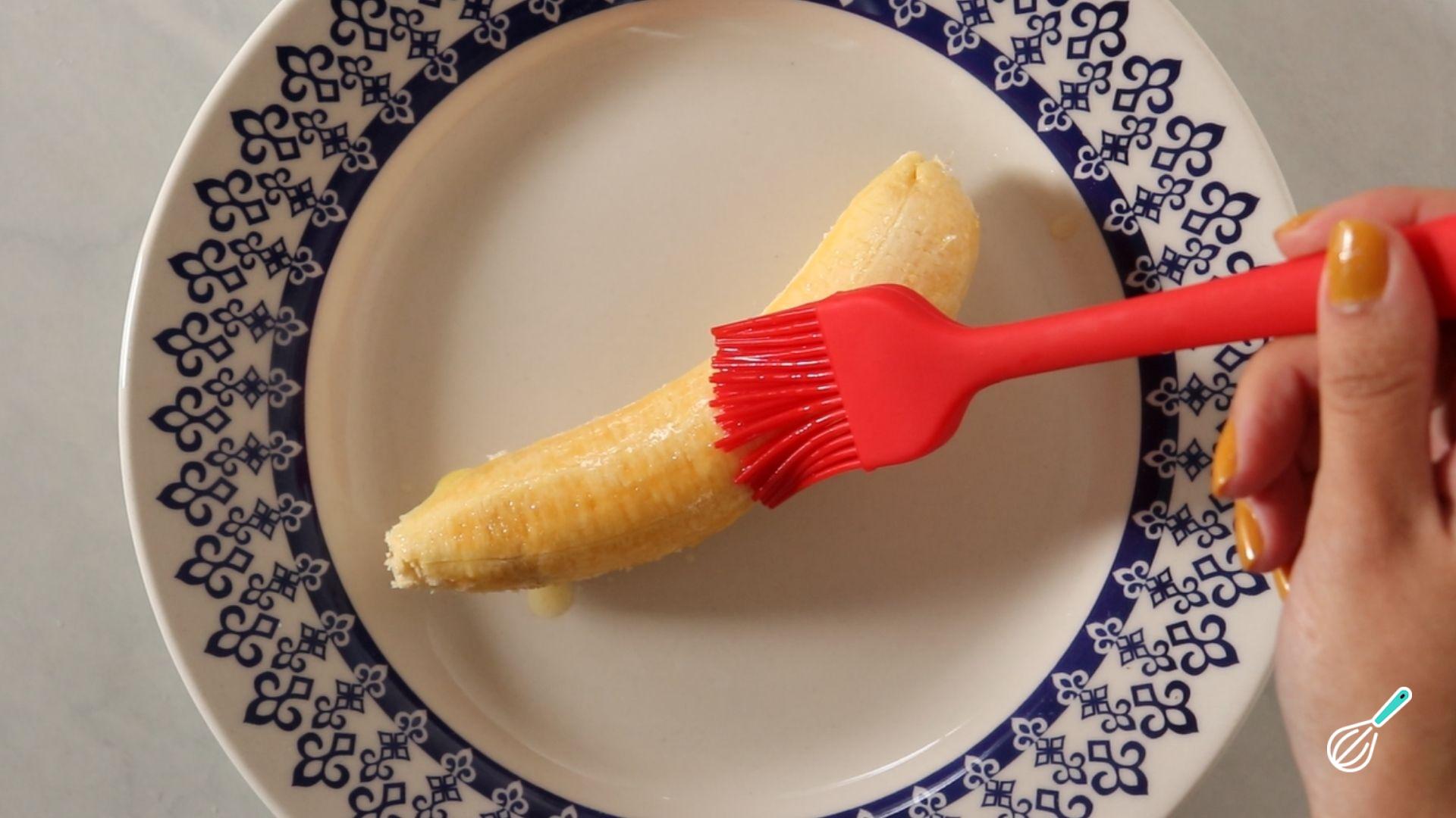 Descasque a banana e pincele a manteiga derretida.