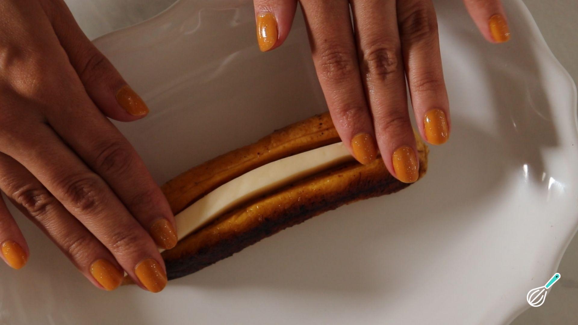 Retire do forno e faça um corte horizontal no meio da banana. Coloque a fatia de queijo e leve de volta ao forno por 1 minutinho, só para aquecer o queijo.