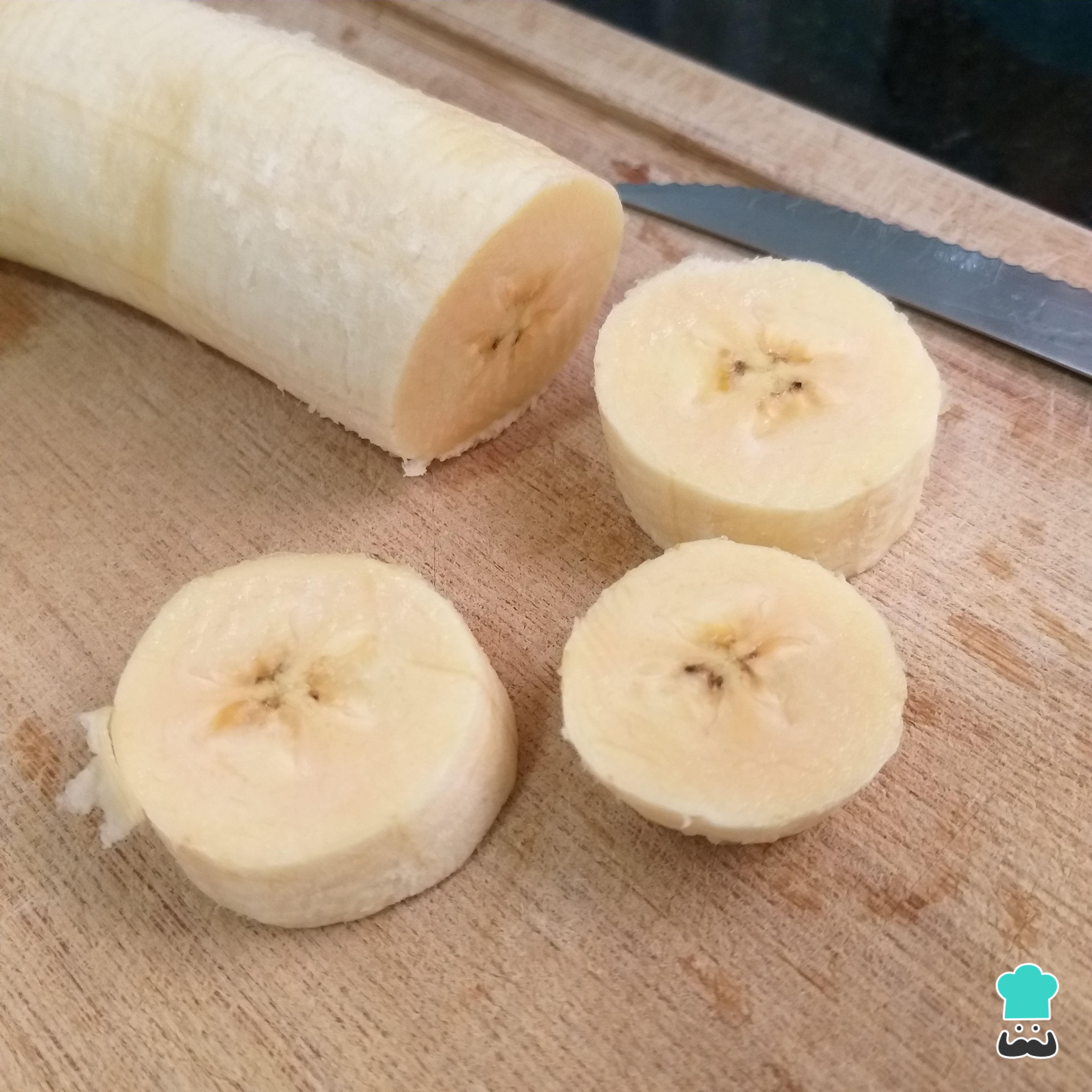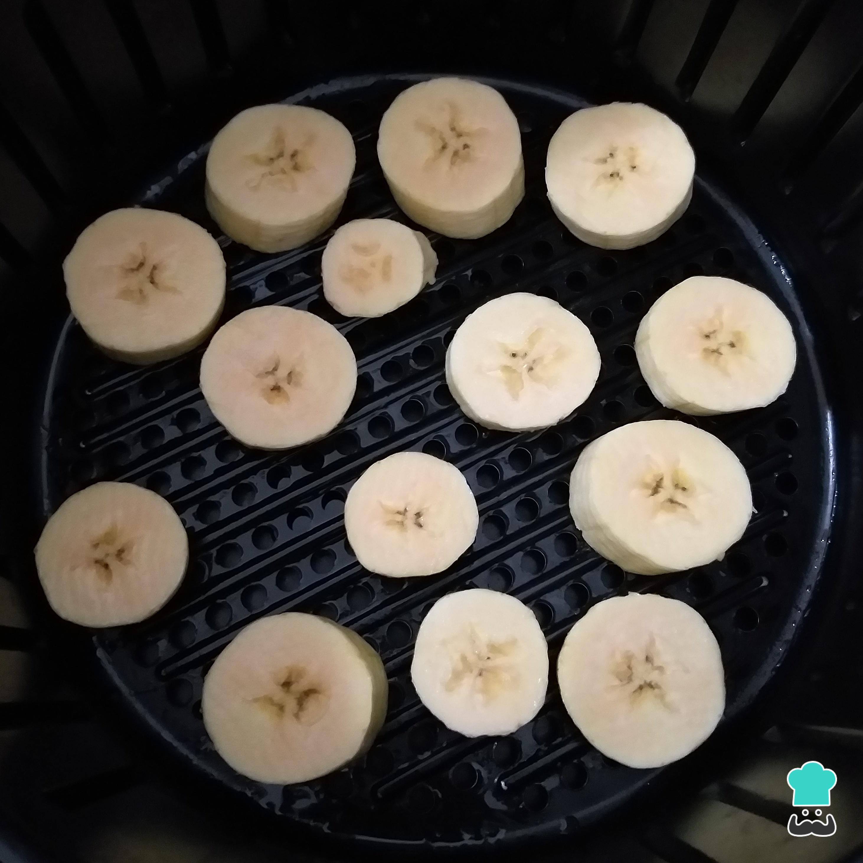 Fatie a banana em rodelas de cerca de 0,5 cm. No entanto, se você está procurando como fazer chips de banana da terra na AirFryer, deverá fatiar a banana em rodelas mais finas.