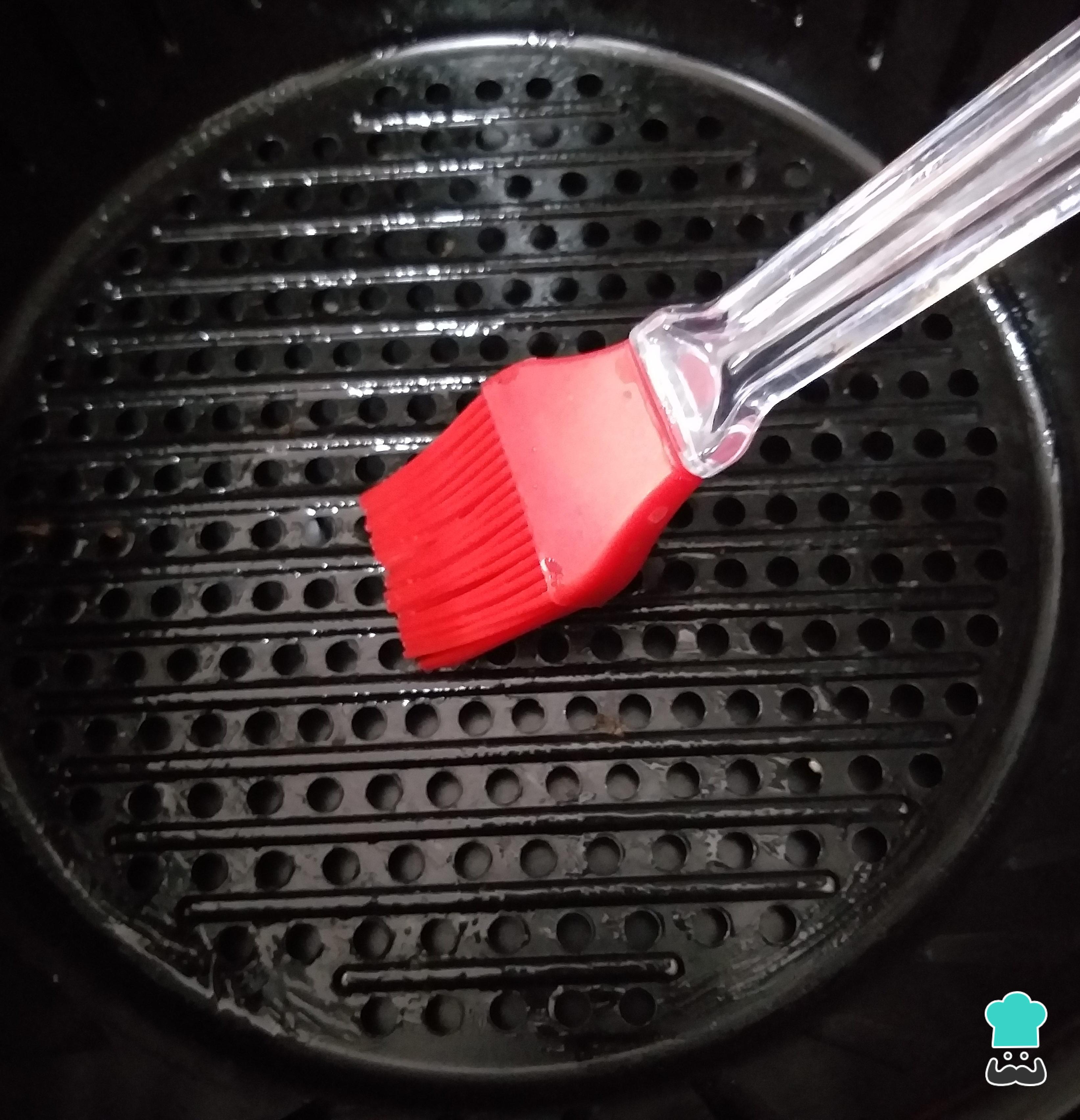 Unte a cesta da AirFryer com óleo de coco e pré aqueça por 5 minutos a 180 graus.