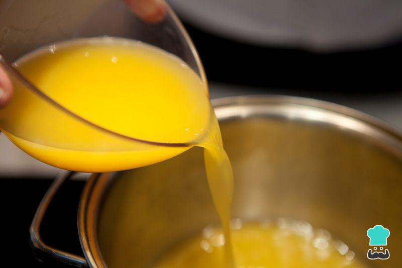 Numa frigideira de cabo longo (faz a diferença na hora de flambar), coloque a manteiga, o açúcar e o suco de laranja. Leve ao fogo médio e deixe cozinhar até virar uma calda espessa.