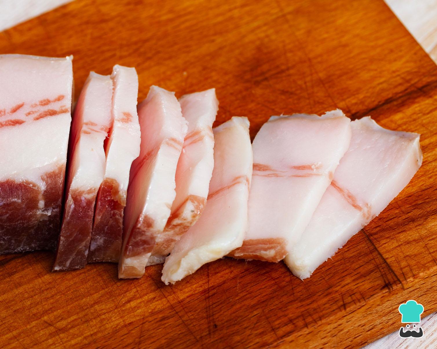 Comece por cortar o toucinho em pedaços ou fatias, do mesmo modo que se estivesse preparando torresmo caseiro. Se quiser tempere com sal (se temperar com sal, a sua banha ficará levemente salgada).