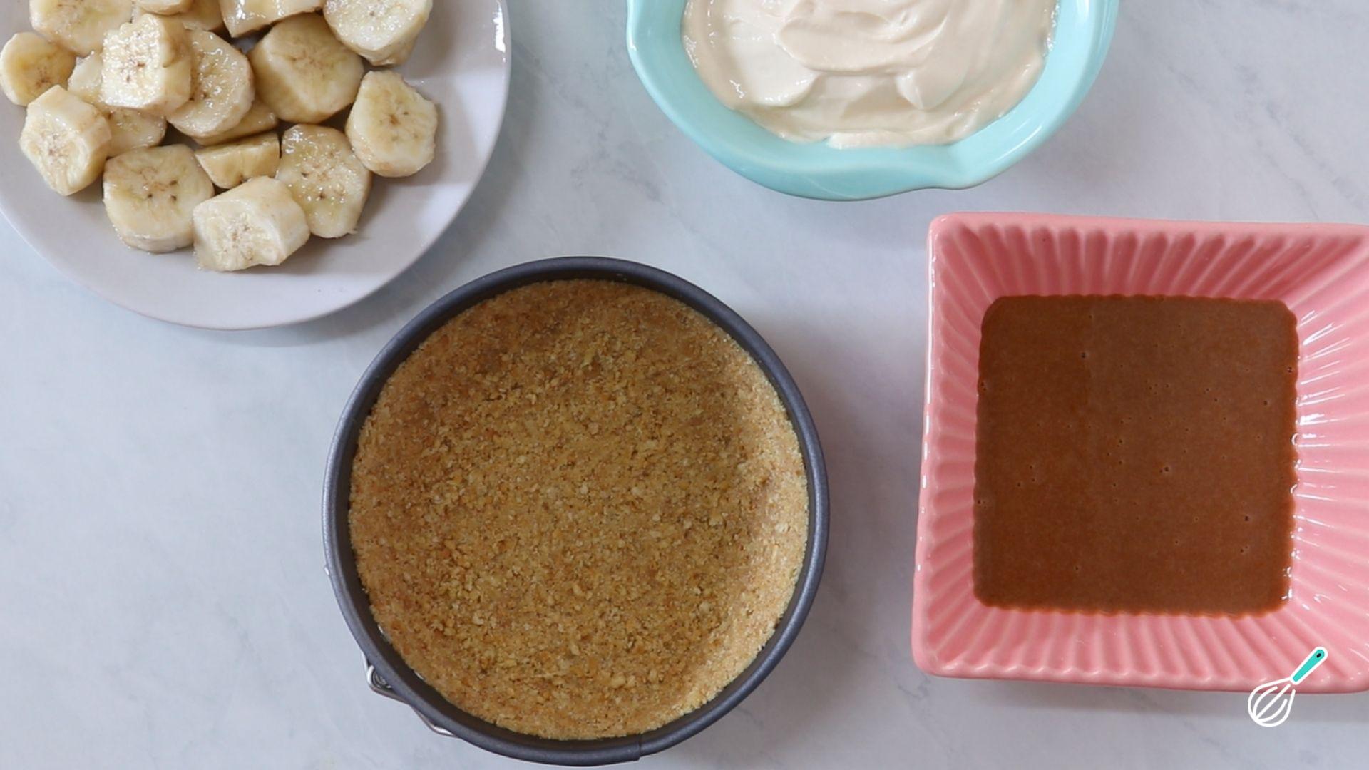 Em seguida forre o fundo e as laterais de uma forma de fundo falso. Essa será a base da nossa torta de banana com doce de leite.