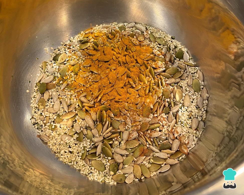 Tempere as sementes, ainda quentes, com a cúrcuma e a canela. Reserve.
