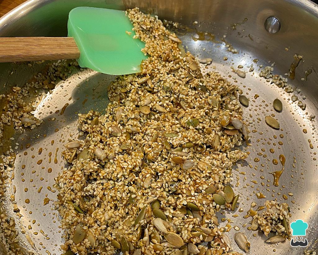 Comece sua Barrinha de Sementes torrando suas sementinhas. Para isso aqueça uma frigideira, coloque as sementes e mexa com uma colher até elas começarem a mudar de cor (ficarem mais douradas).