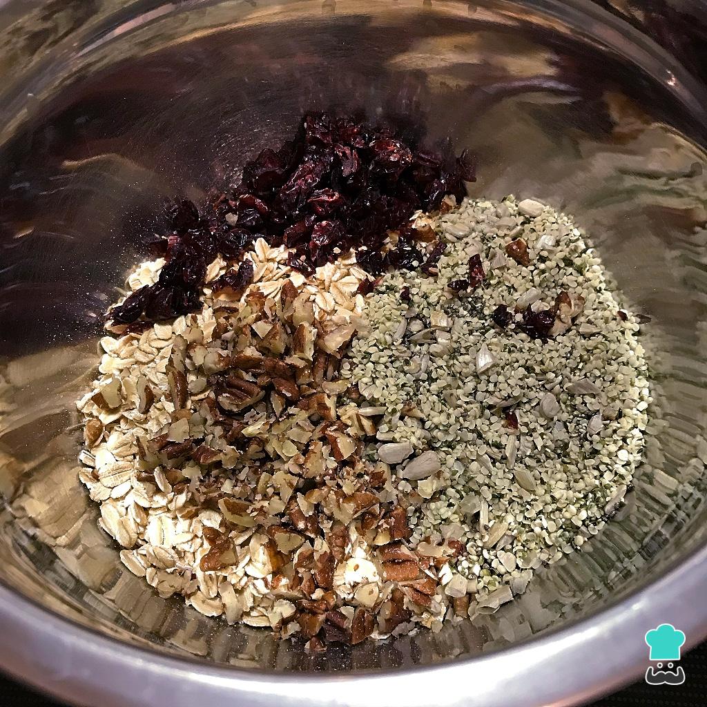 Comece sua super barrinha misturando os secos: aveia, sementes, pecãs, frutas secas e uma pitada de sal