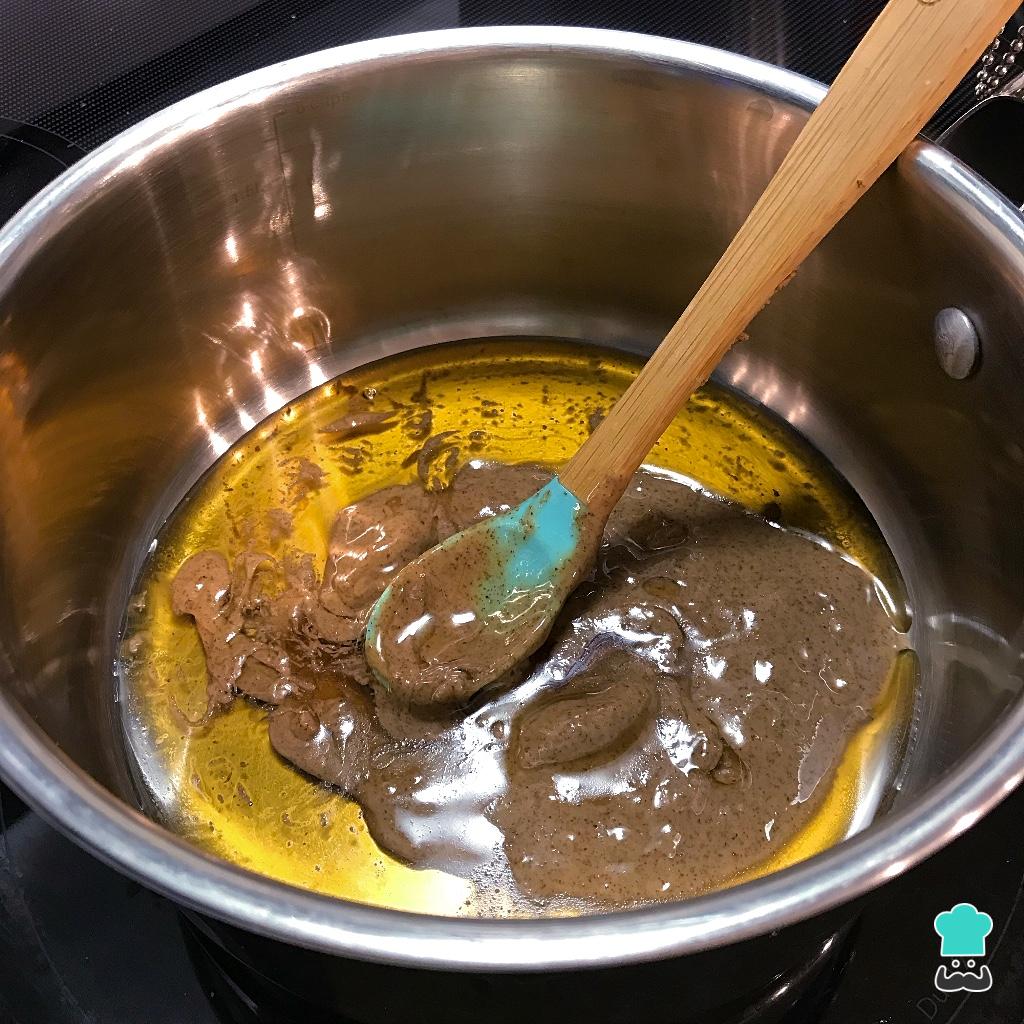 Numa panela aqueça o xarope de bordo com a manteiga de amêndoas só o suficiente para eles ficarem fluídos e se misturarem.