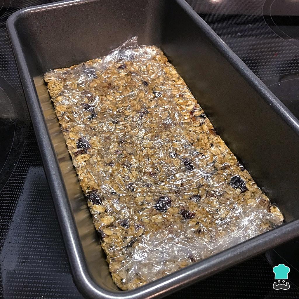 Cubra uma forma de pão de forma com papel filme e coloque a mistura da barrinha de cereal caseira apertando bastante, fazendo ela ficar bem compacta.