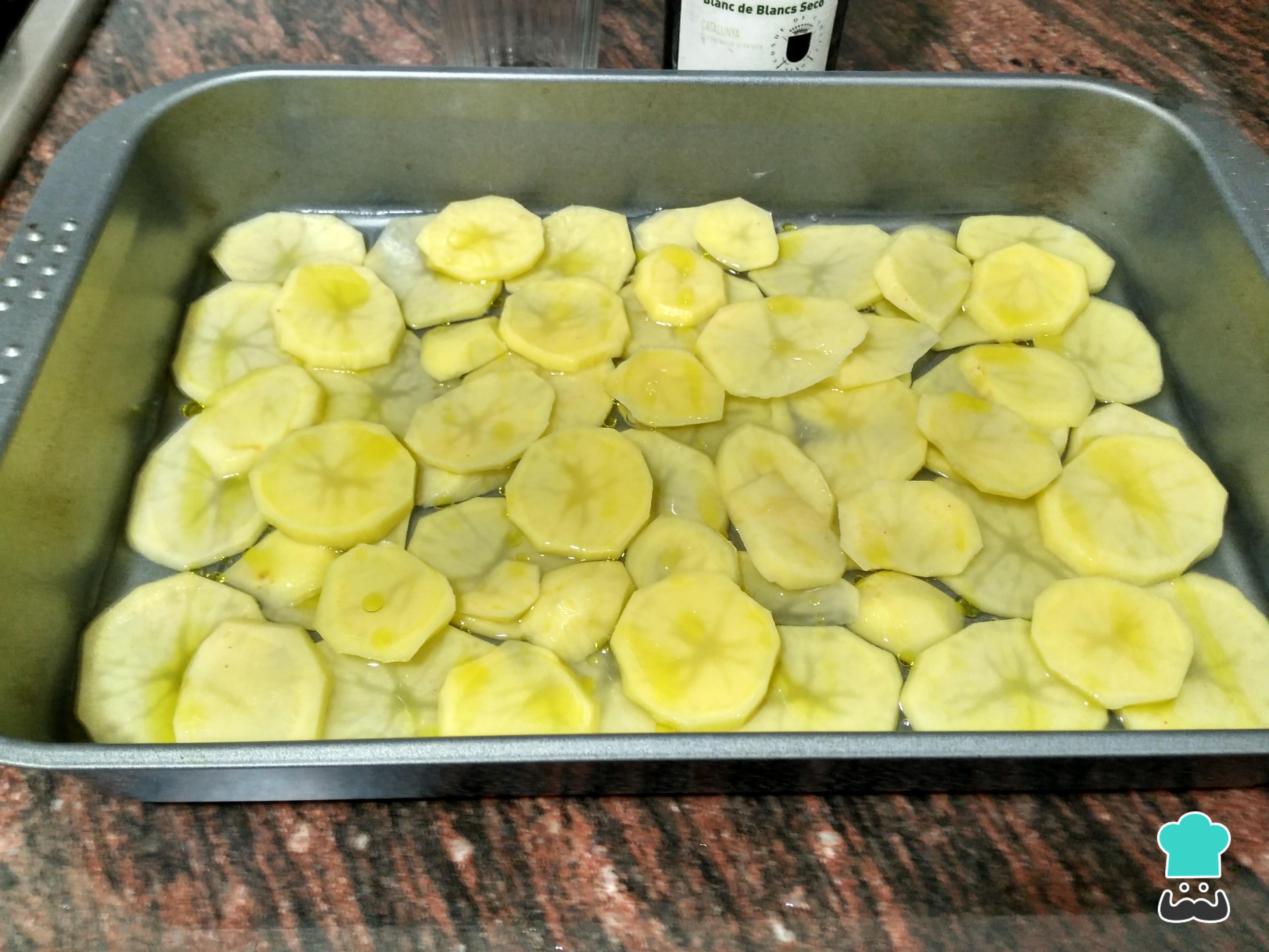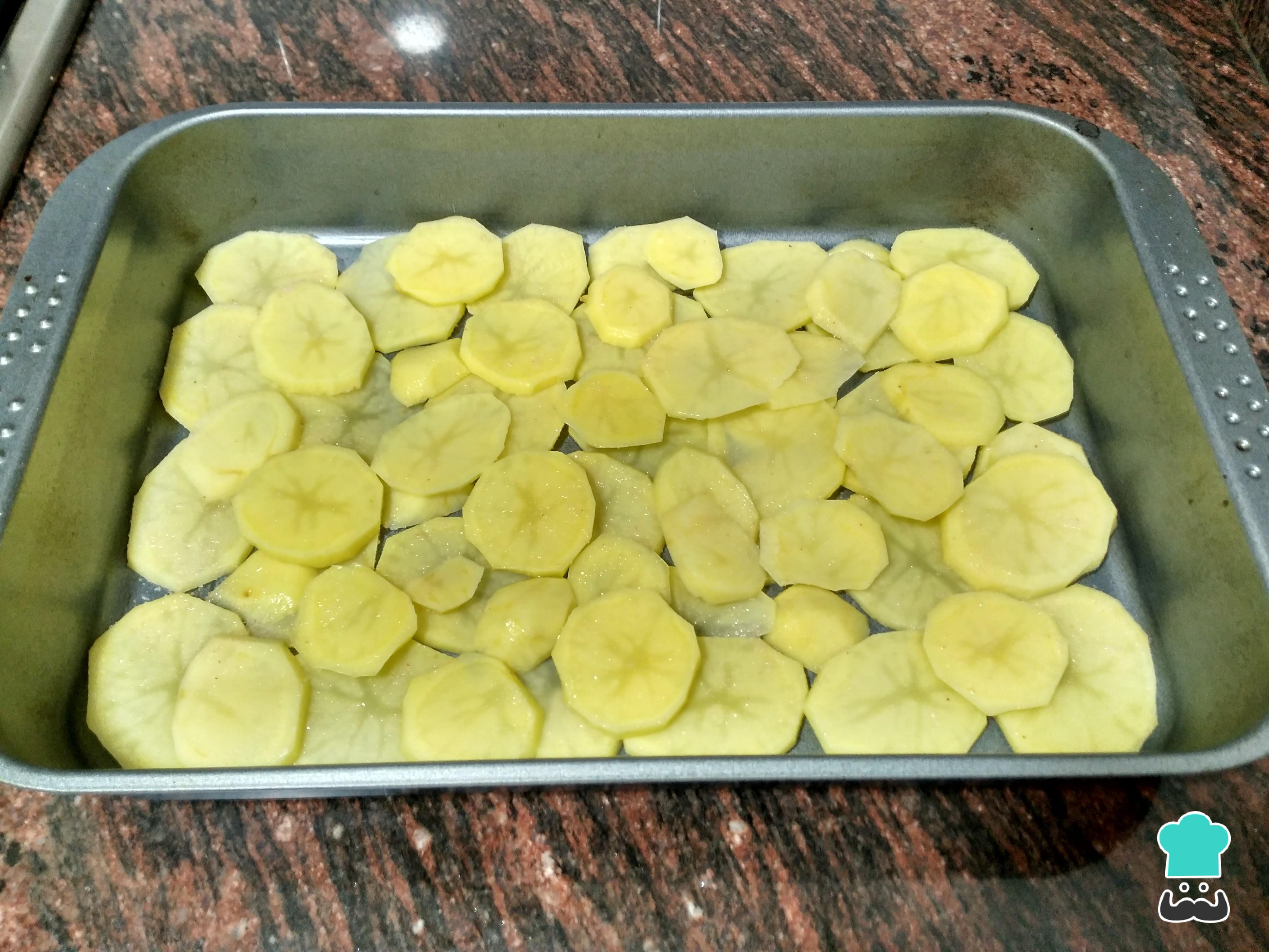 Para fazer essa receita de batata ao forno comece por preaquecer o forno a 190ºC. Em seguida descasque as batatas, lave e corte em rodelas não muito grossas nem muito finas.
