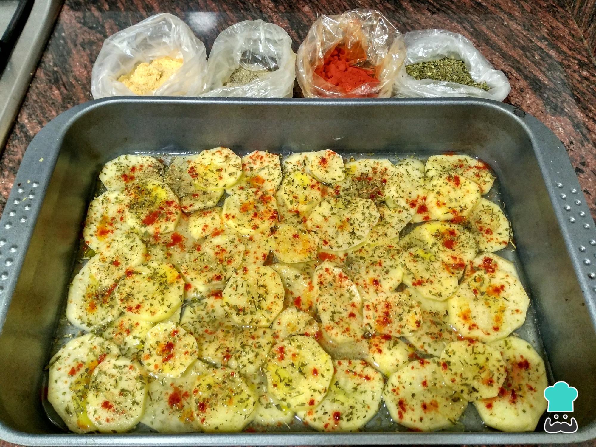 Agora tempere suas batatas com um pouco de páprica, alho em pó, pimenta do reino e ervas finas. A quantidade é a gosto, mas modere para que as batatas não fiquem com um sabor muito intenso.