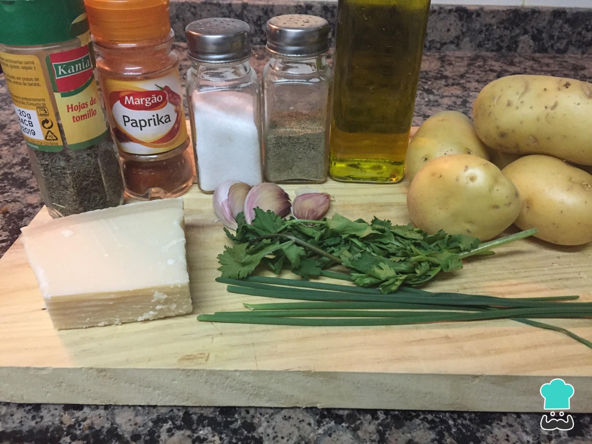 Para fazer esta receita de batata assada com ervas e parmesão, comece por juntar todos os ingredientes necessários.