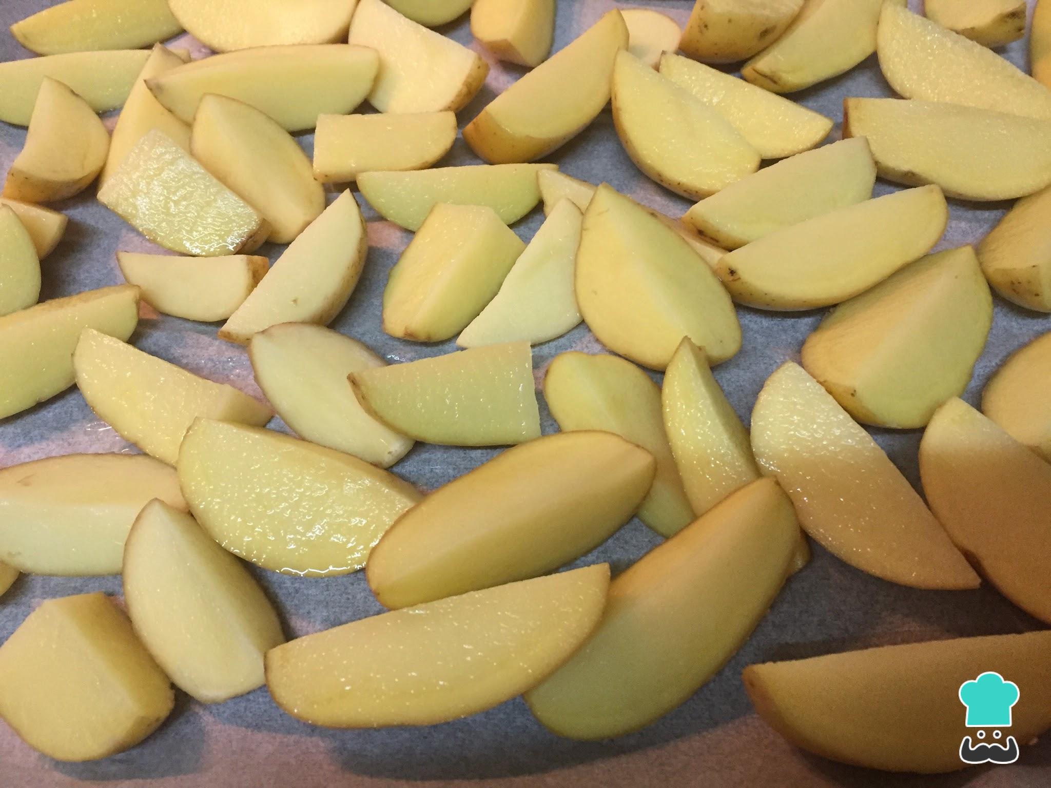 Forre um tabuleiro de forno com papel manteiga. Lave bem as batatas, corte-as em gomos e coloque no tabuleiro.