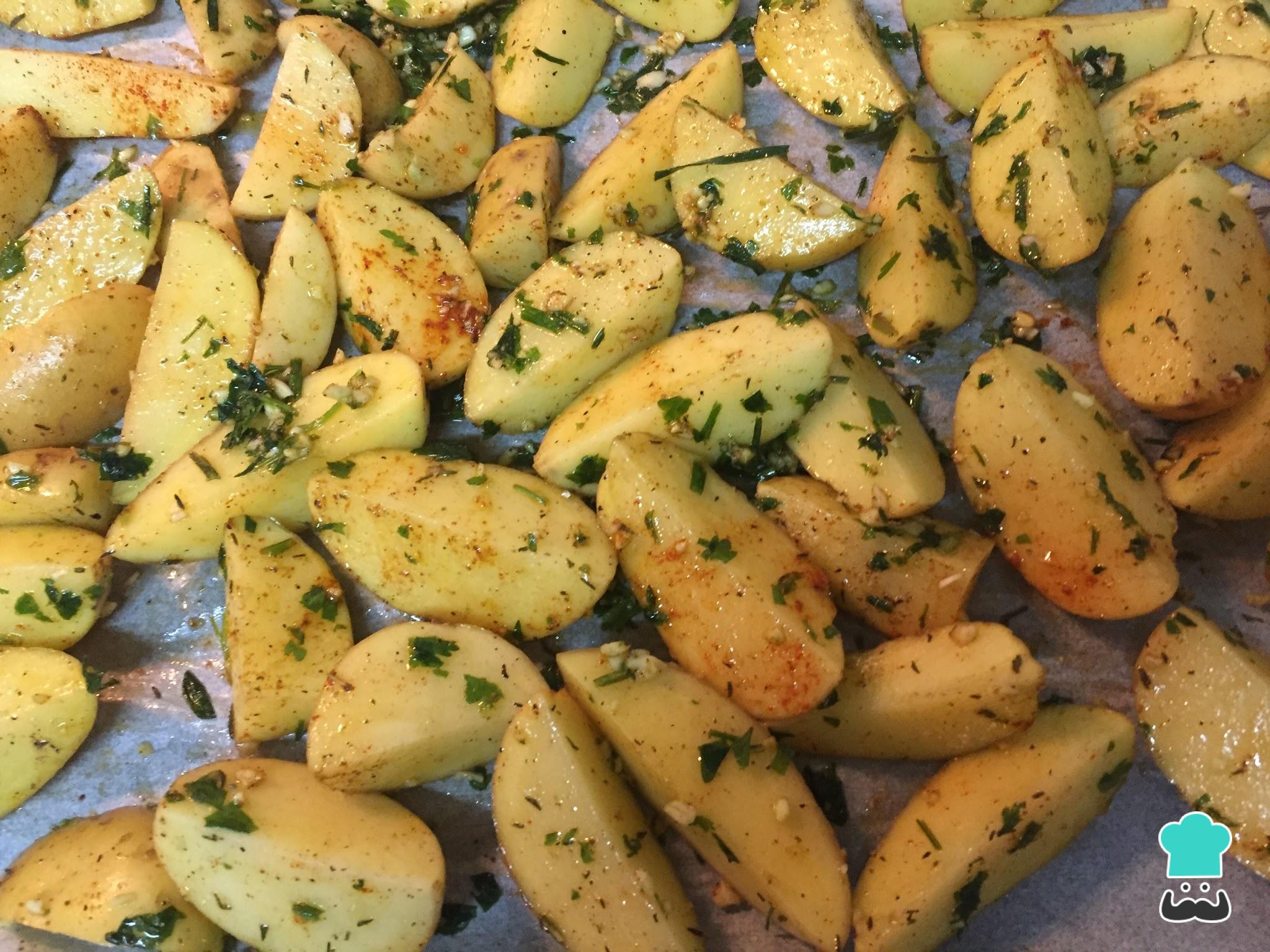 Pique os dentes de alho, juntamente com as ervas aromáticas. Tempere as batas com as ervas, o sal, a pimenta do reino, a paprica, o tomilho e o azeite.