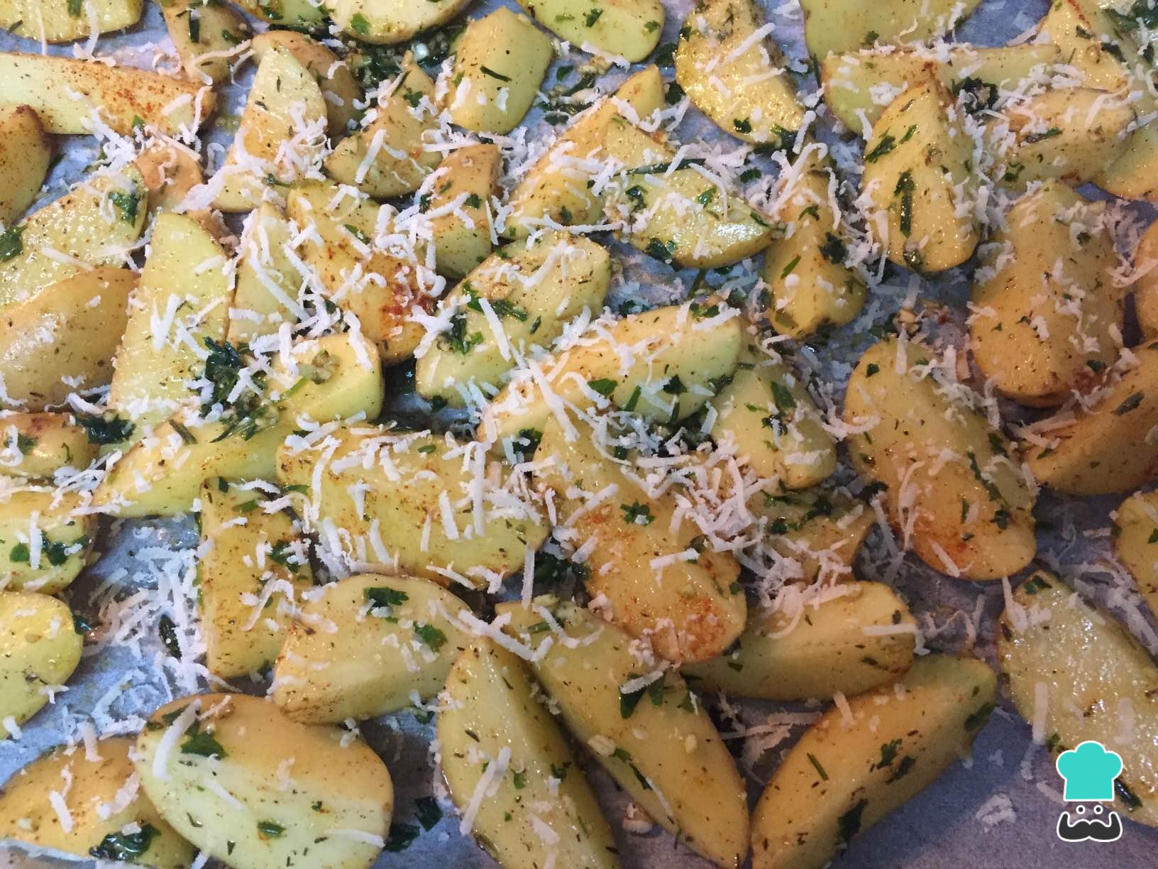 Depois de temperar as batatas, rale queijo parmesão por cima das batatas e leve ao forno a 200ºC por 30 minutos.