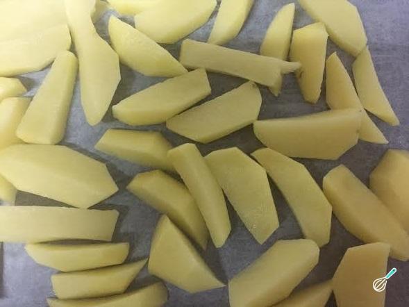 Cubra um refratário com uma folha de papel manteiga, descasque as batatas e corte-as em quartos.