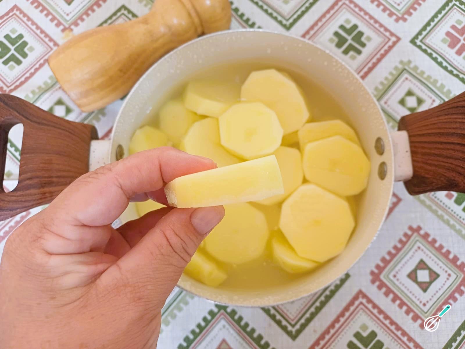 Descasque as batatas e corte em rodelas médias, não muito grossas. Coloque em uma panela com água e um pouco de sal e cozinhe por cerca de 10 minutos, até ficarem macias, mas ainda firmes. Escorra e reserve.