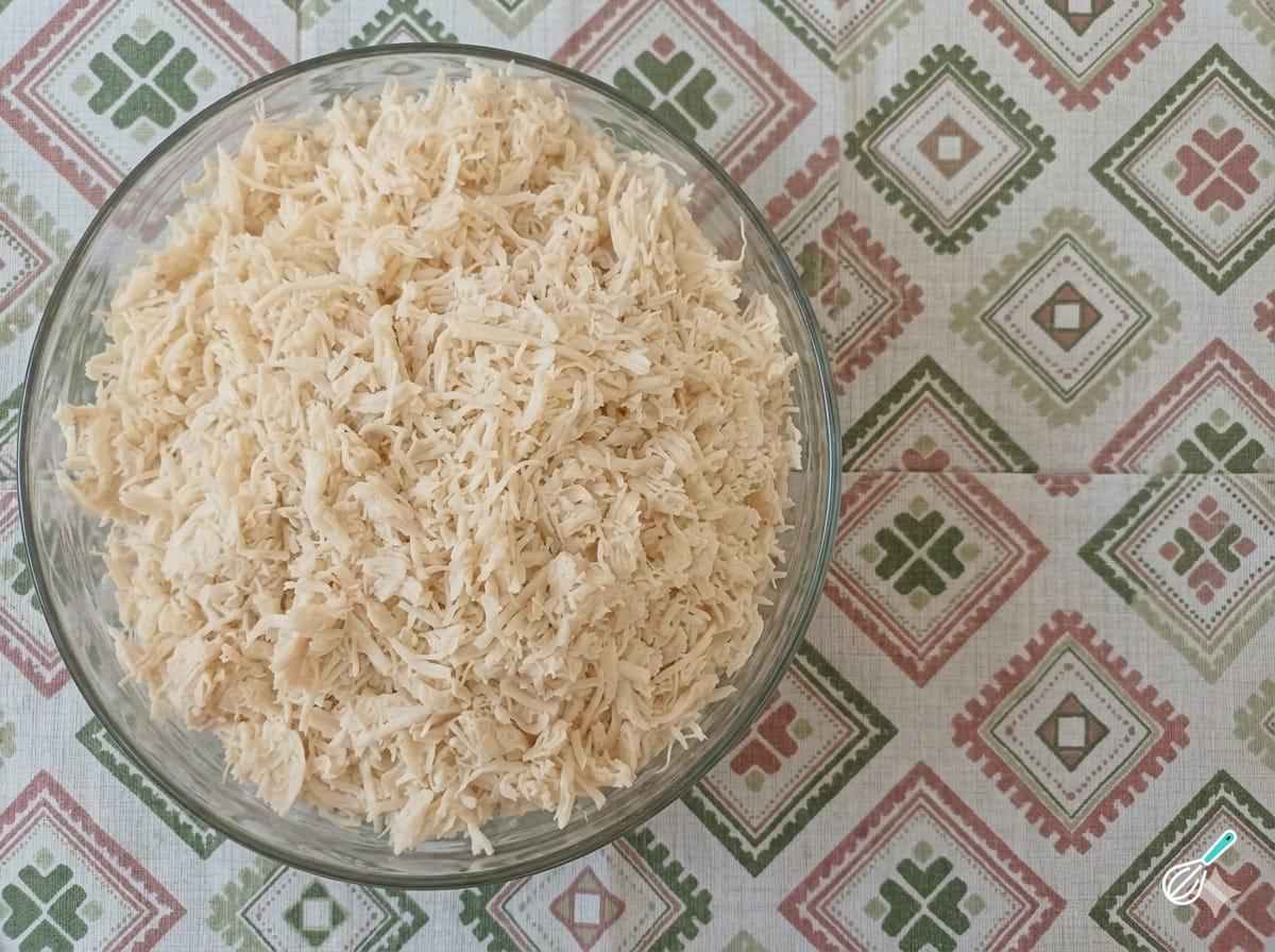 Se ainda não estiver pronto, cozinhe o peito de frango com água e sal e depois desfie.