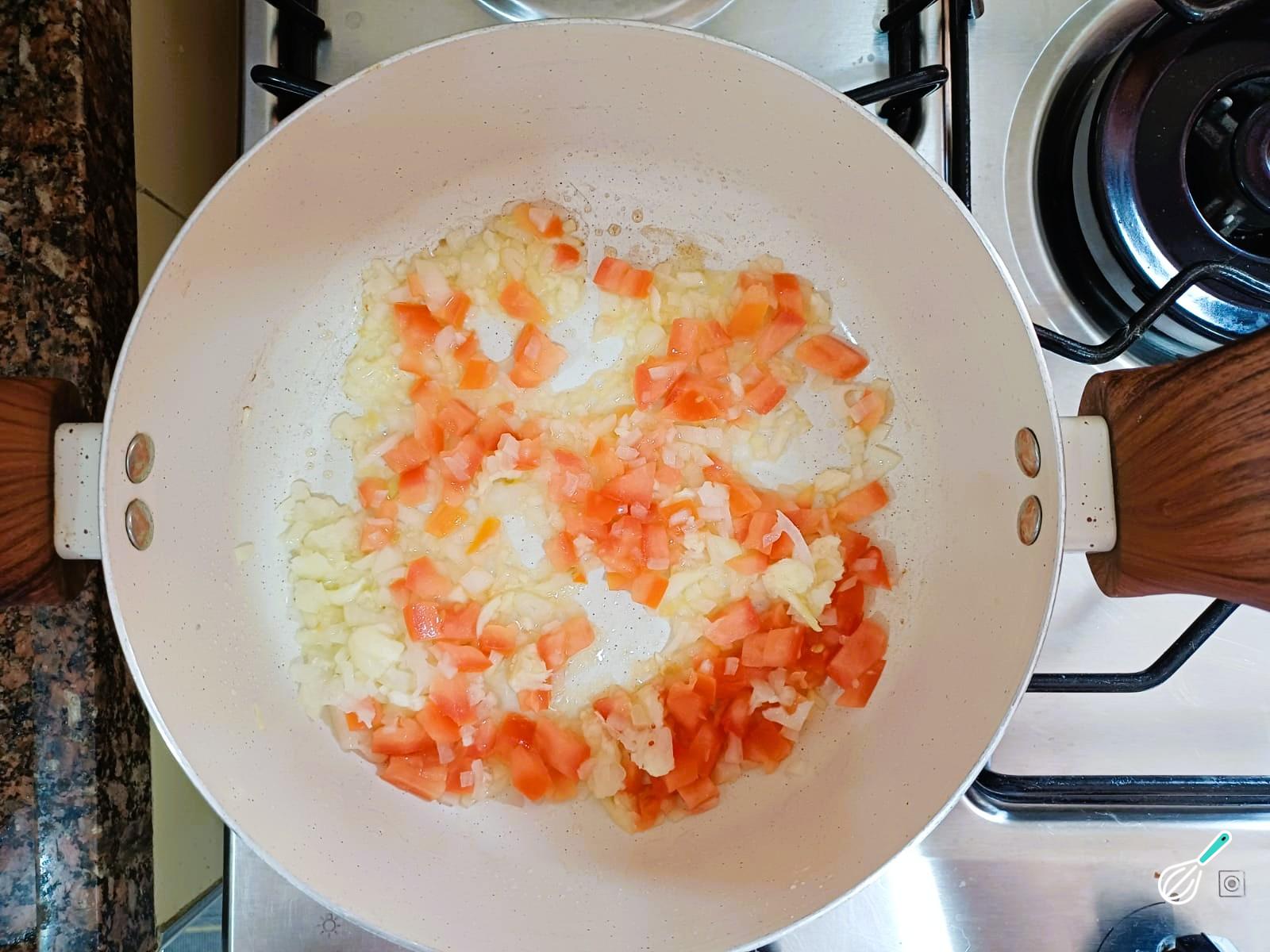 Em uma panela média, aqueça um fio de óleo ou azeite. Refogue a cebola até ficar transparente e em seguida adicione o alho amassado. Coloque o tomate picado e deixe cozinhar até começar a desmanchar.