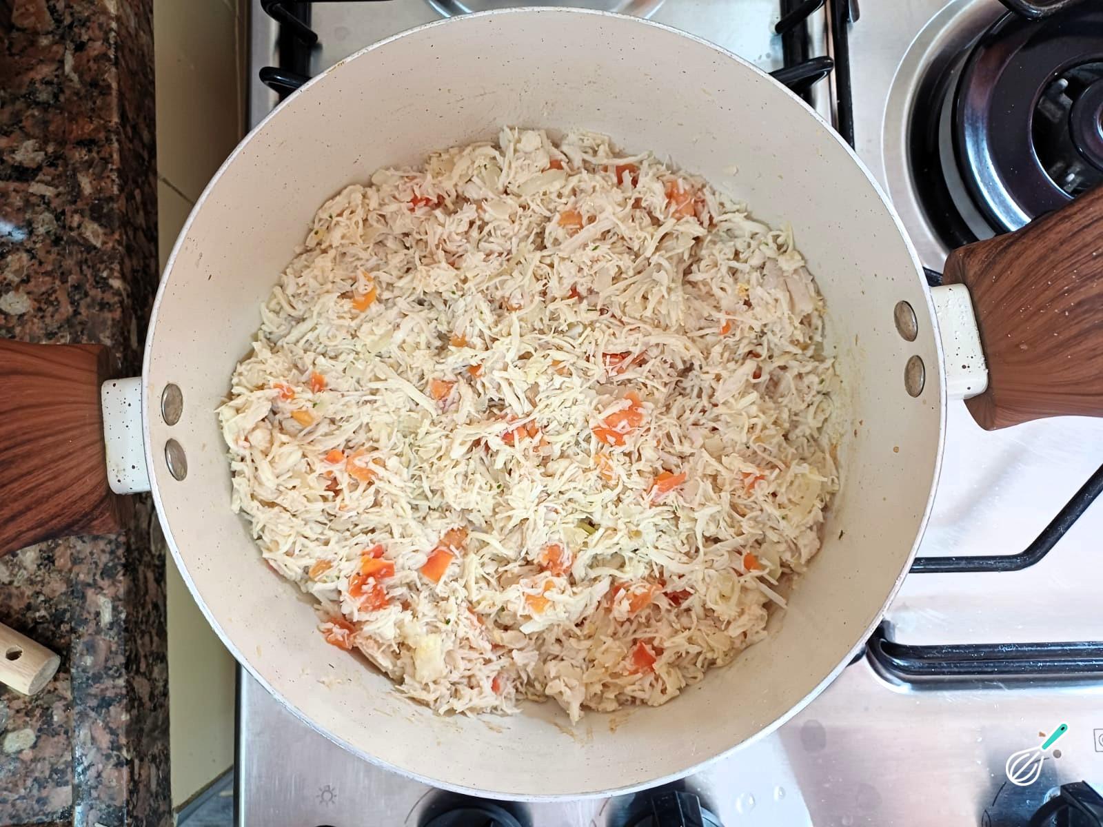 Adicione o frango desfiado ao refogado, tempere com sal, pimenta do reino e misture bem. Deixe refogar por alguns minutos para incorpor os sabores.
