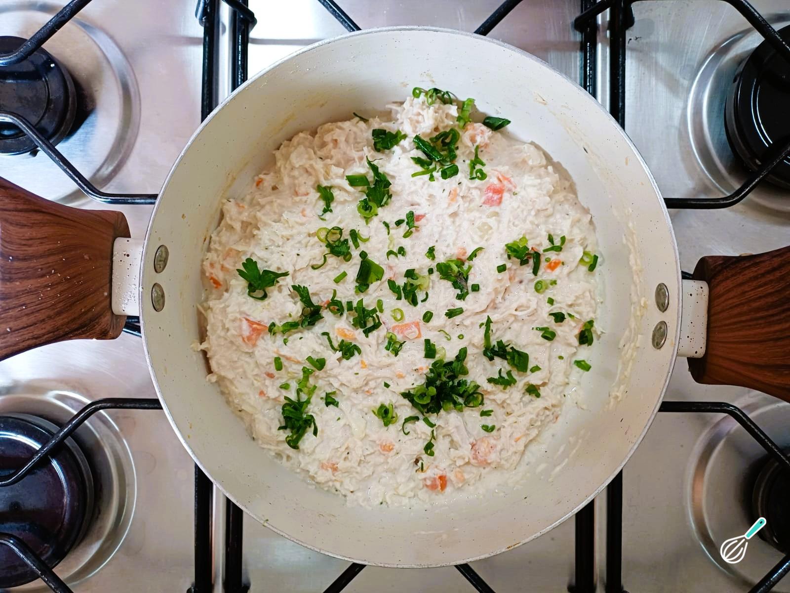 Acrescente o creme de leite e o requeijão, mexendo até formar um creme bem homogêneo e saboroso. Finalize com cheiro verde picado a gosto.