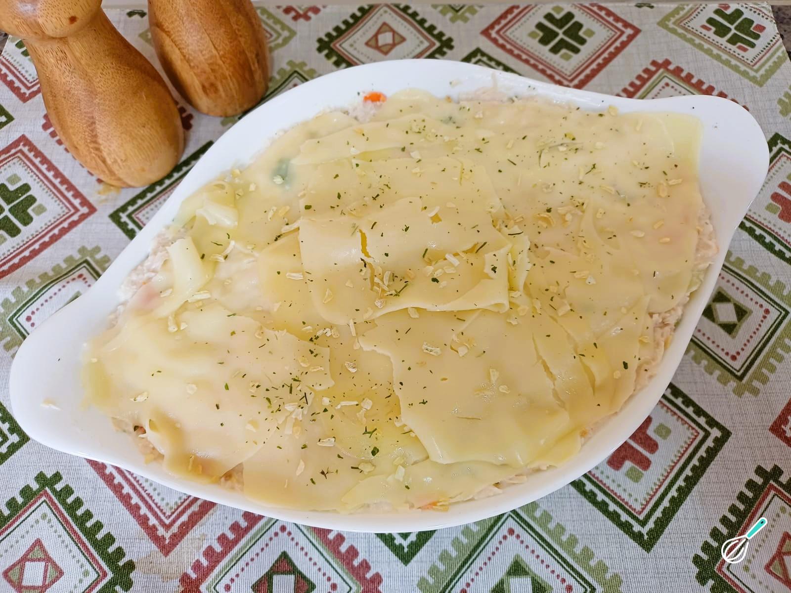 Em uma travessa refratária, faça uma camada de batata cozida. Cubra com uma camada de frango cremoso. Repita as camadas até terminar os ingredientes.