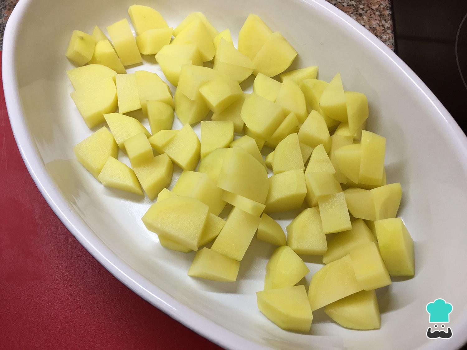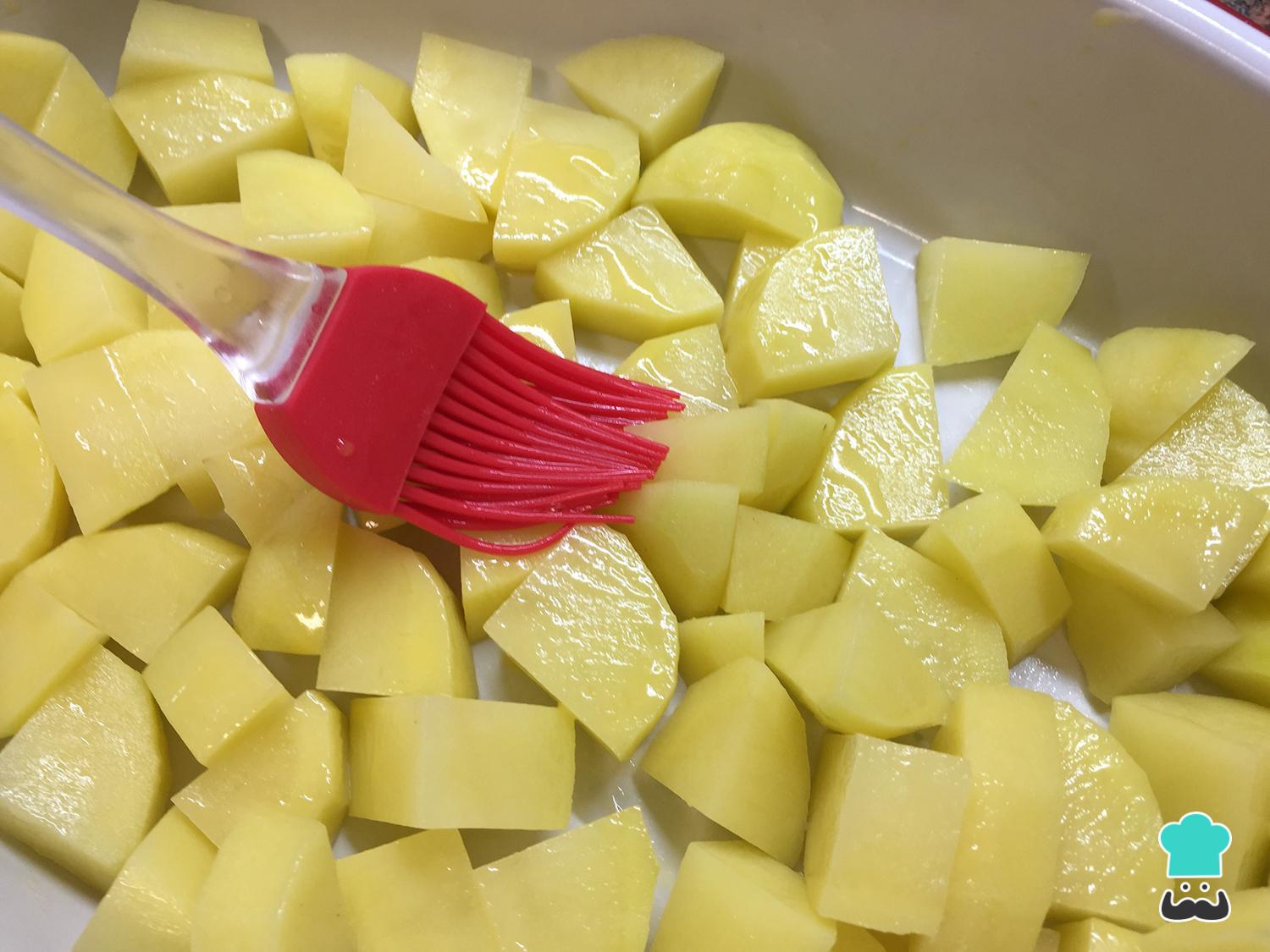 Descasque as batatas, lave e pique em cubinhos do mesmo tamanho. Coloque numa assadeira untada e ligue o forno nos 200ºC.