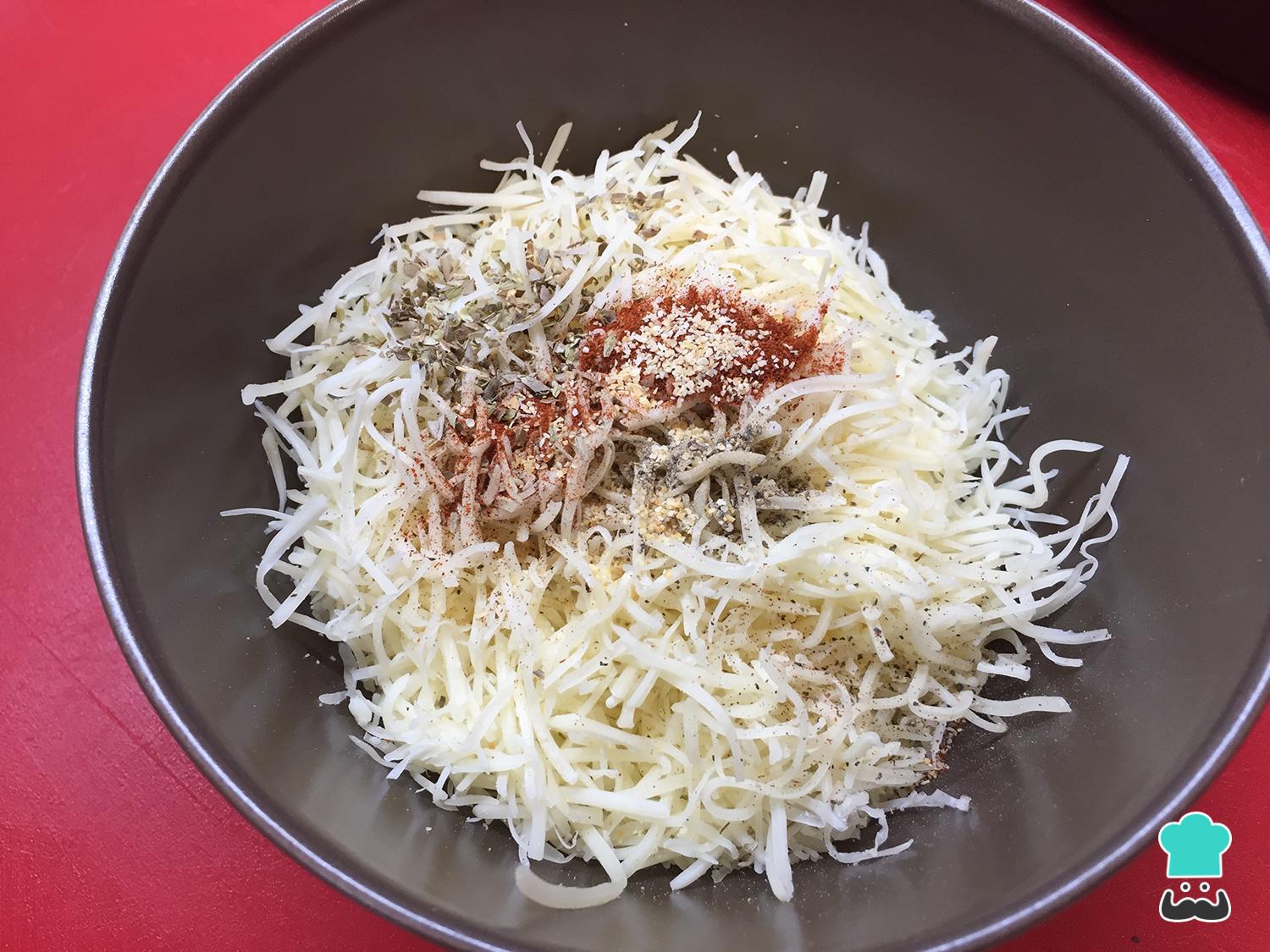 Polvilhe a mistura de queijo e temperos sobre as batatas e misture tudo com as mãos ou com uma colher.