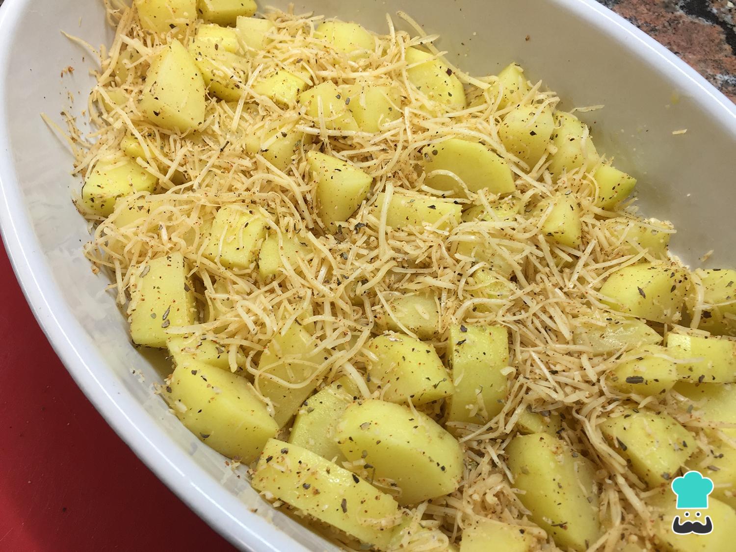 Dica: Se você preferir pode colocar a mistura de queijo e temperos sobre as batatas e deixar assim, sem misturar. Desse jeito as batatas assam com uma crosta de queijo.