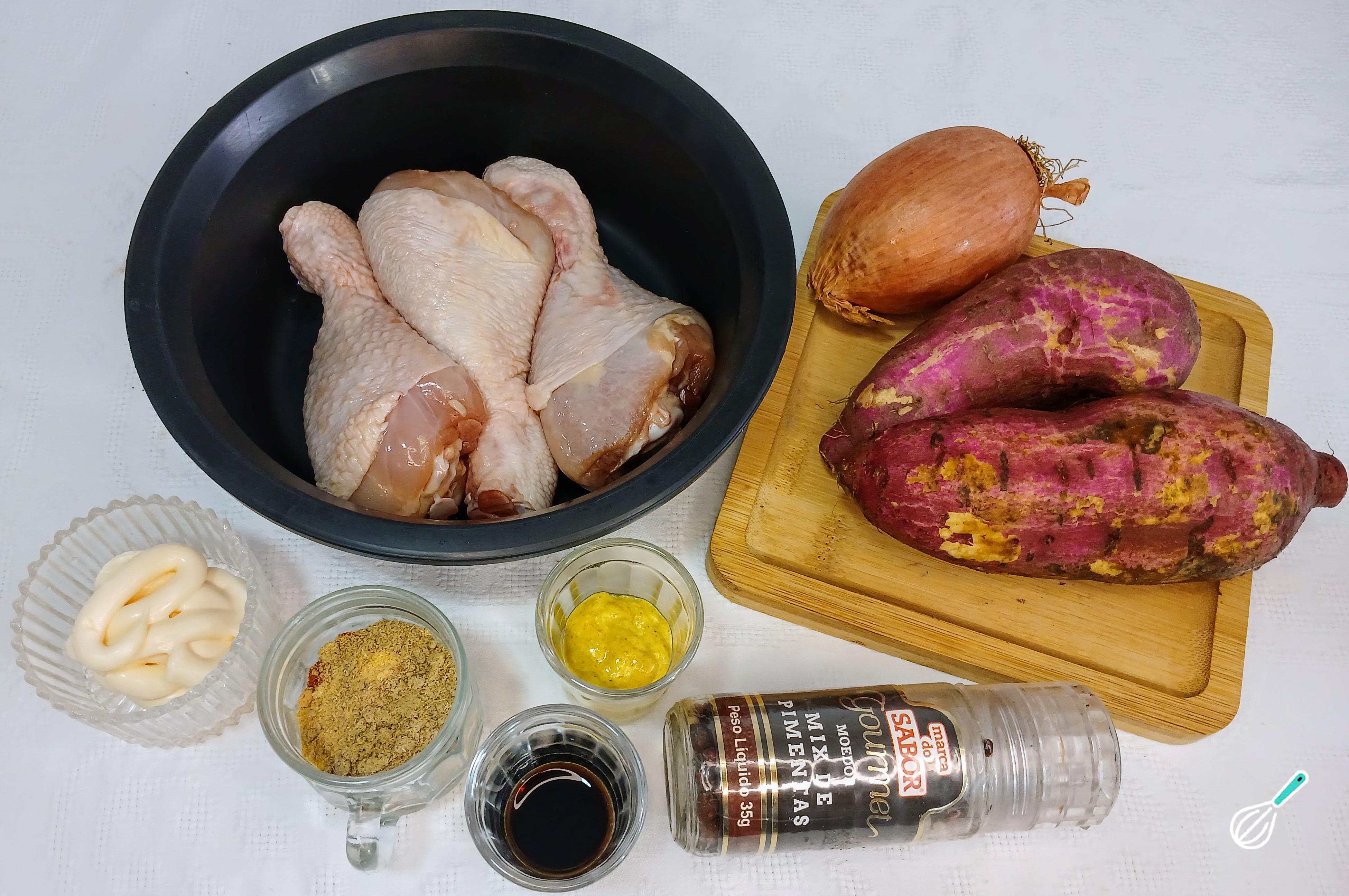 Comece separando os ingredientes para o preparo da batata doce com frango. Separe as coxas de frango, as batatas doces e a cebola. Separe a maionese, a mostarda amarela e o molho inglês. Separe também os temperos de sua preferência. Separe a pimenta e o sal.