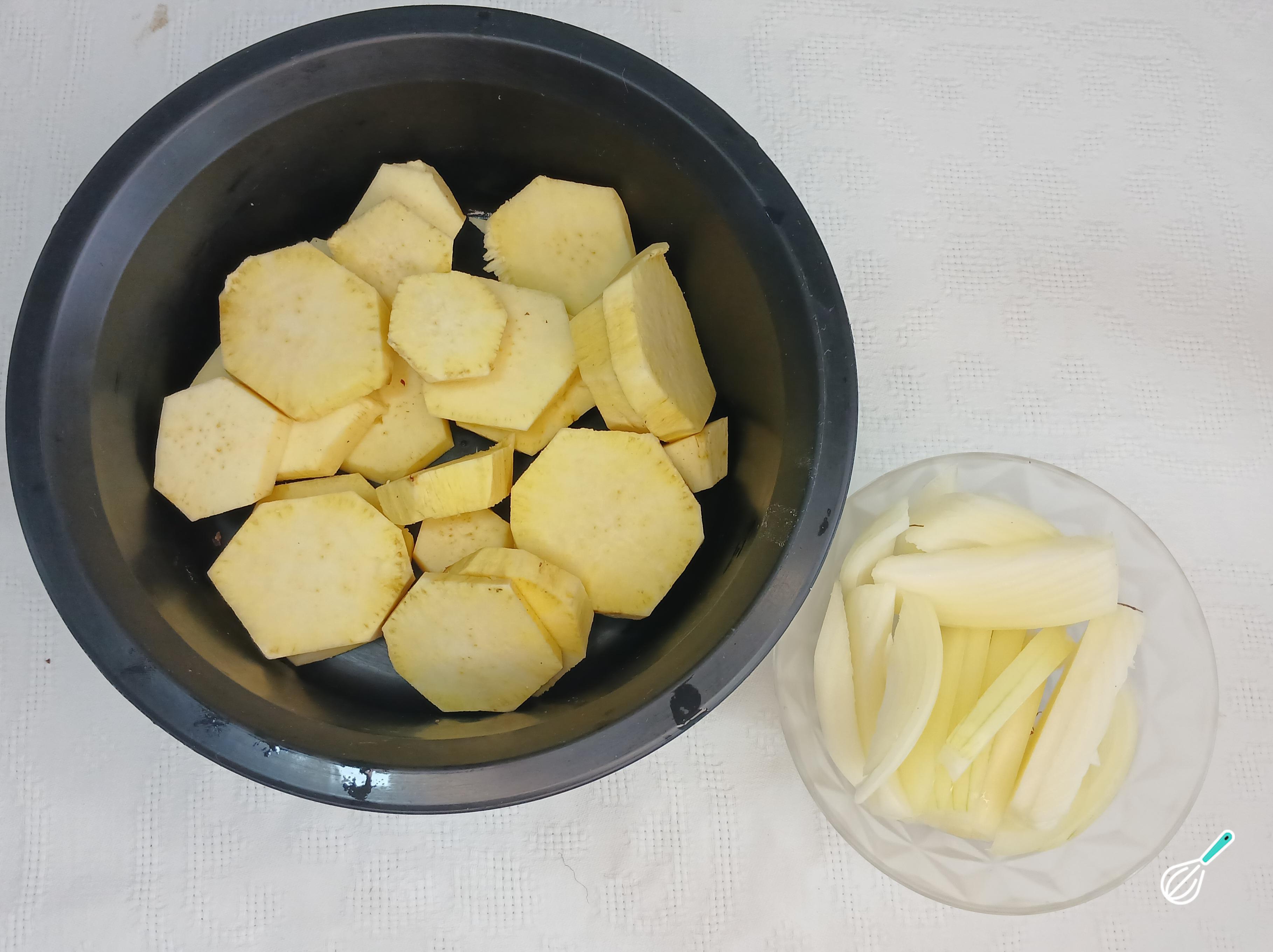 Dica: Enquanto prepara a cebola deixe as batatas doces cortadas dentro de uma vasilha com água, isso evita que fiquem escurecidas.