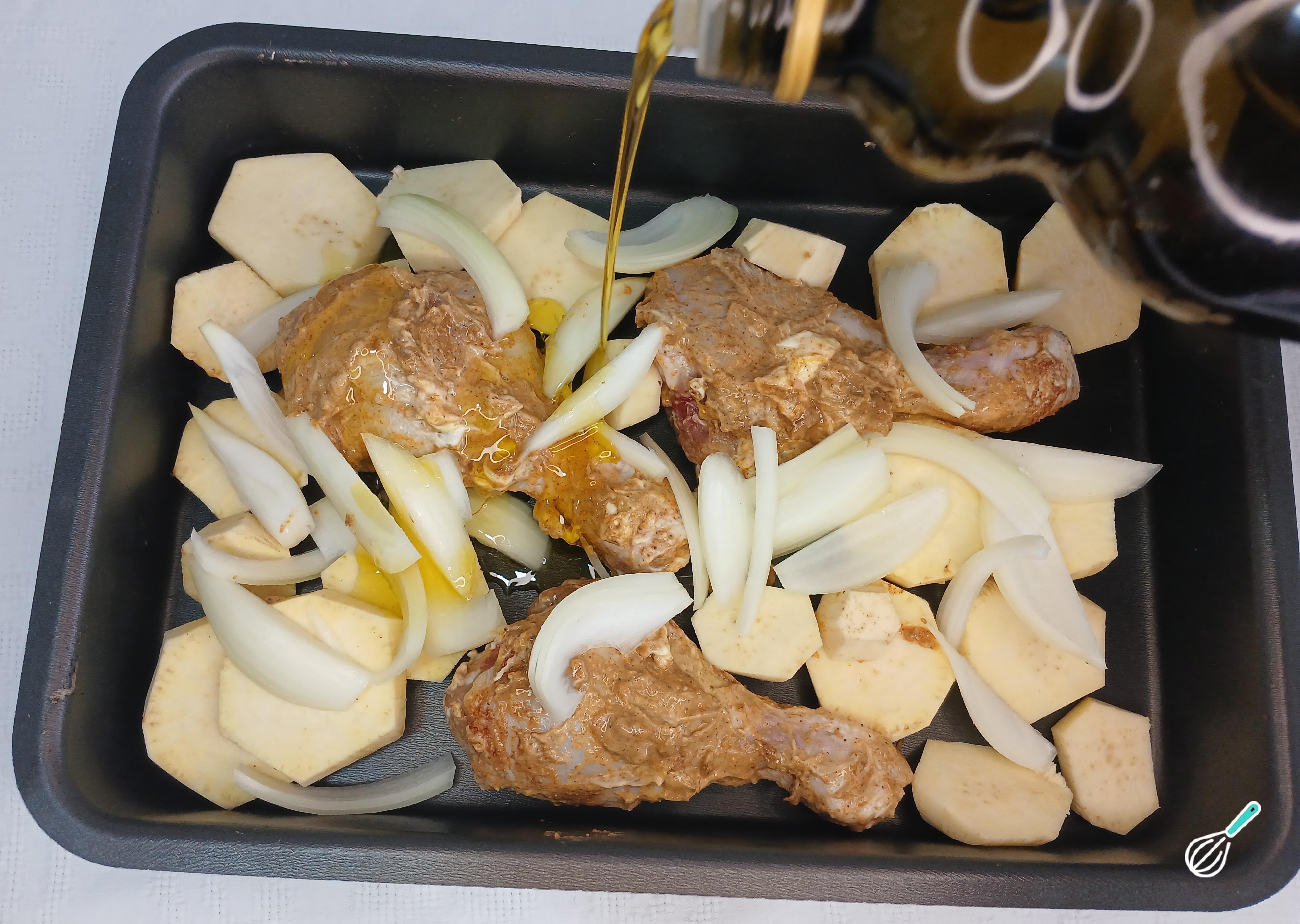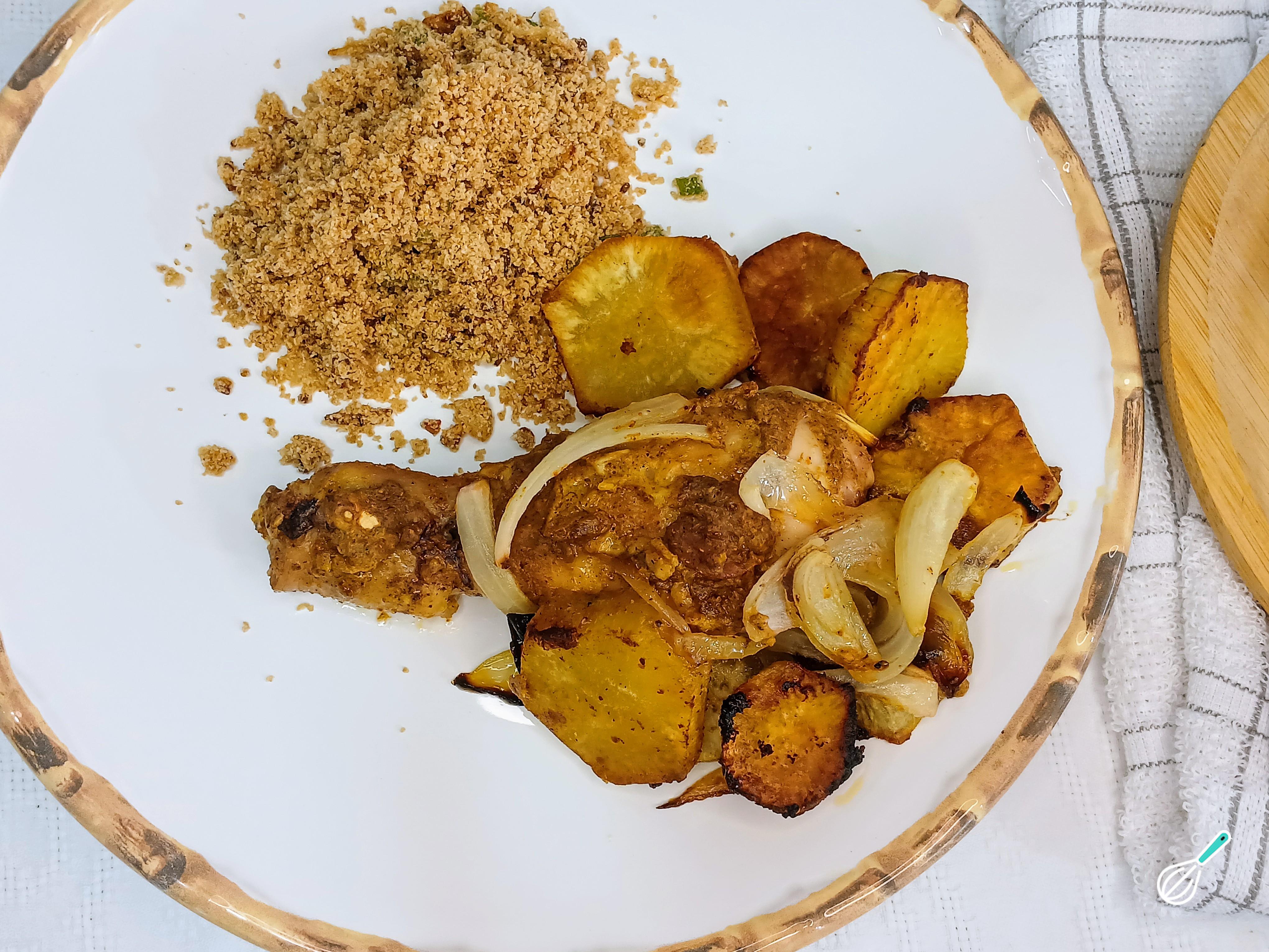Feito isso, em uma assadeira antiaderente coloque as coxas de frango que estavam descansando na geladeira, as batatas doces cortadas e a cebola branca. Regue com azeite e leve ao forno a 220° C por aproximadamente 50 minutos. Lembre-se que as coxas precisam assar bem pois tem ossos. Vire as batatas doces dos dois lados para que assem por igual. Depois de assadas e douradas, desligue o forno e retire a assadeira.