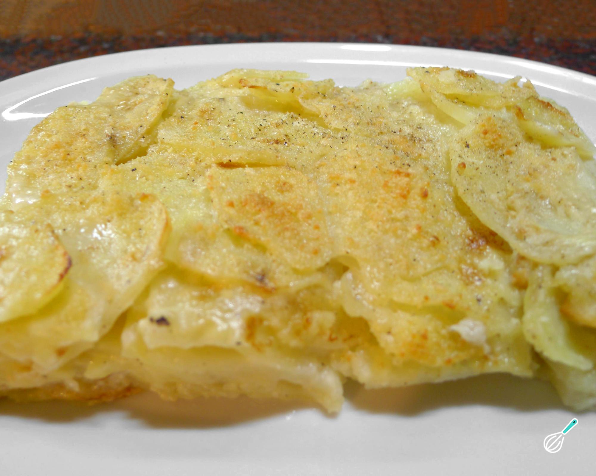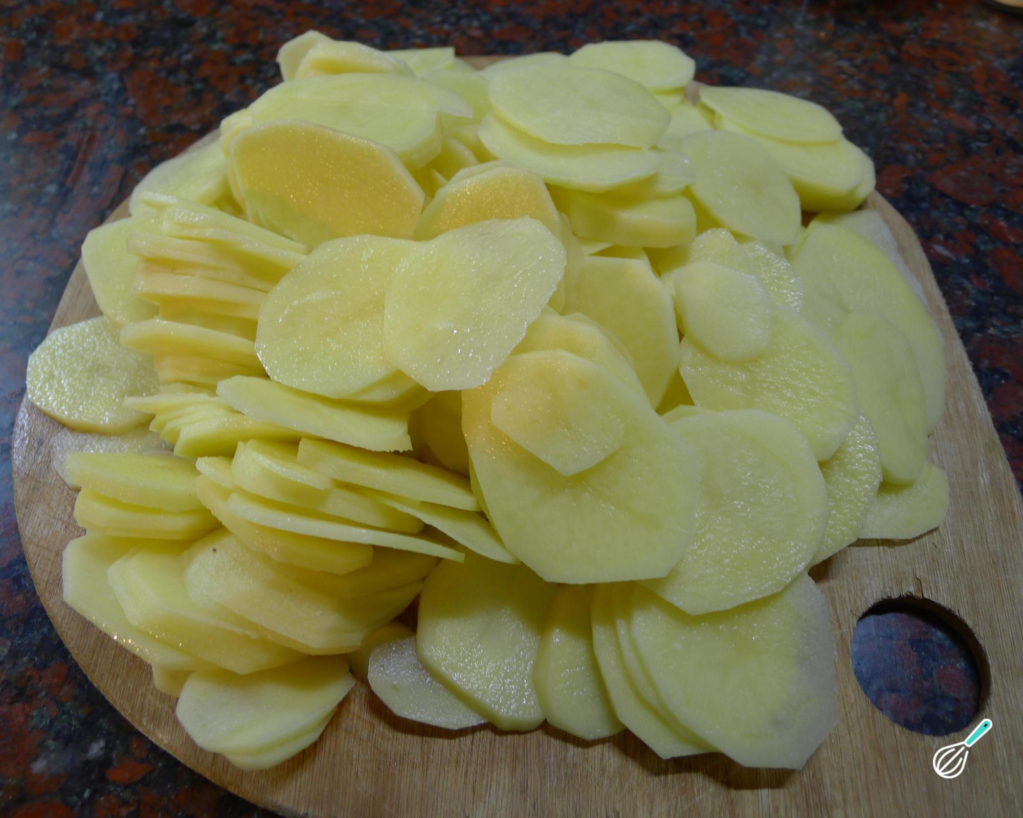 Dica: Cortar as batatas em rodelas finas faz com que cozinhem mais depressa. Porém não deixe as rodelas finas demais para que as rodelas não desmanchem.