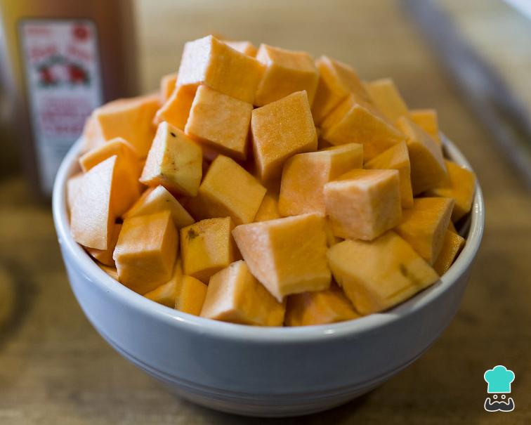 Dica: Não deixe a batata doce ferver muito tempo para que não fique macia demais. Ela deve ficar somente um pouco cozida, para terminar de cozinhar no forno.