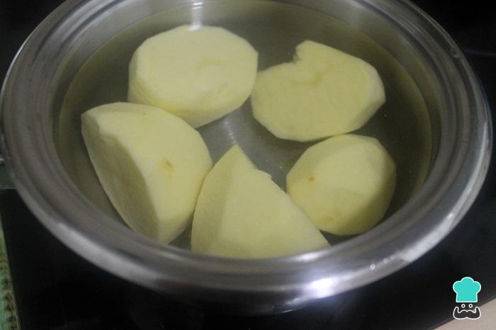 Primeiramente descasque e lave as batatas. Corte em pedaços, para que cozinhem mais depressa, e leve ao fogo uma panela com água até cobrir. Polvilhe sal e deixe por 30-40 minutos ou até ficarem bem macias, desfazendo.